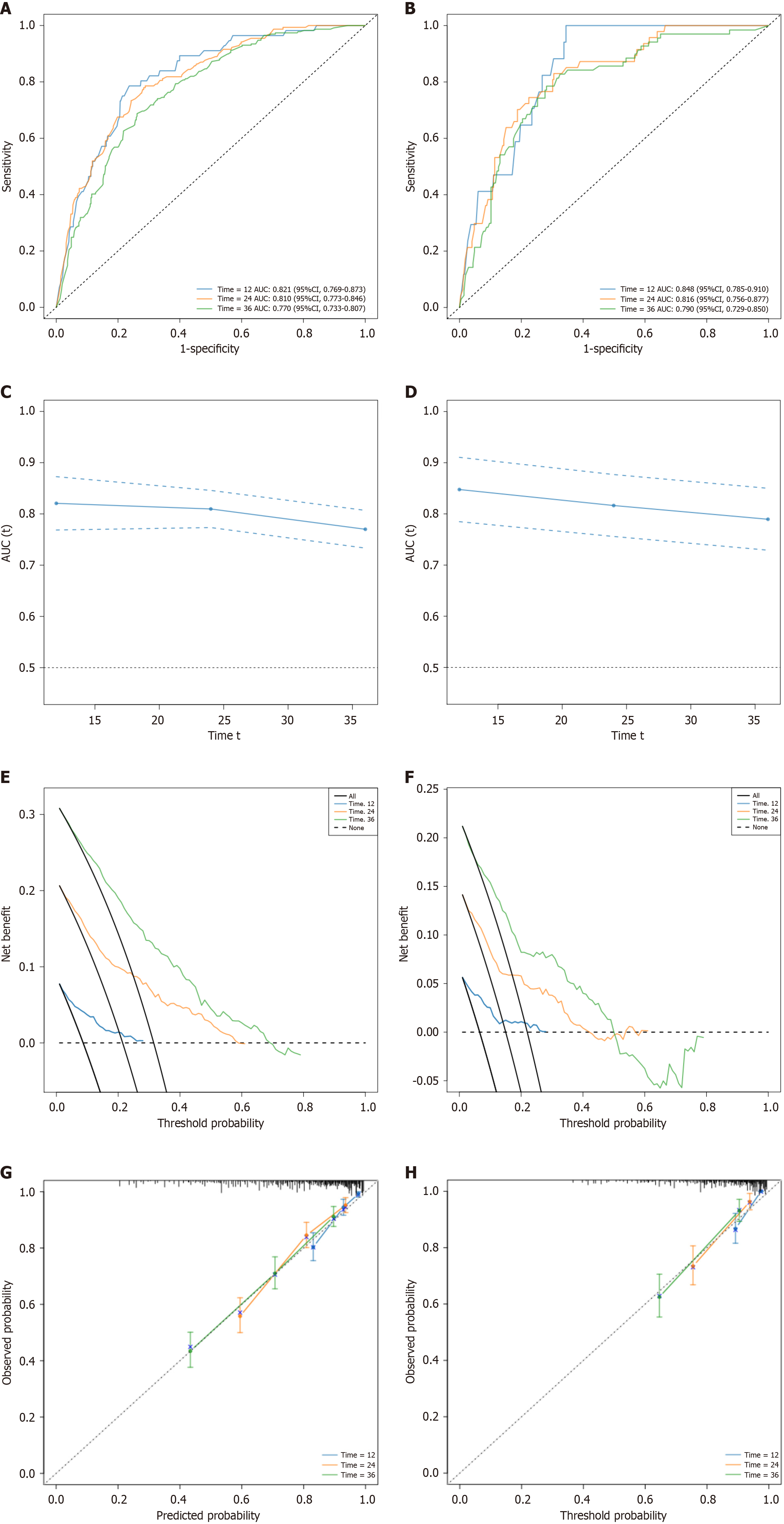 A: Receiver operating characteristic (ROC) curve of Nomogram model predicting 1-year, 2-year, and 3-year prognosis of patients in the training set; B: ROC curve of Nomogram model predicting 1-year, 2-year, and 3-year prognosis of patients in the validation set; C: C-index of the training group; D: C-index of the validation group; E: The decision analysis curve of the training group; F: The decision analysis curve of the validation group; G: Calibration curves for predicting 1-year, 2-year, and 3-year overall survival (OS) rates of patients with stage I-III gastric cancer (GC) in the training cohort. The actual OS rates are plotted on the Y-axis, while the OS rates predicted by the nomogram are plotted on the X-axis; H: Calibration curves for predicting the 1-year, 2-year, and 3-year OS rates of patients with stage I-III GC in the validation cohort. AUC: Area under the receiver operating characteristic curve.