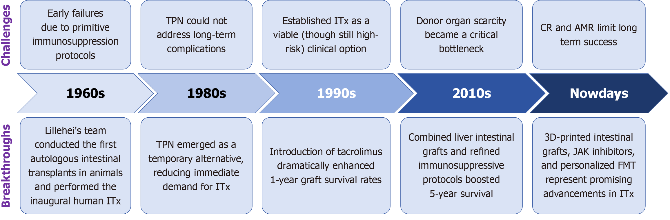 The development of ITx has progressed over six decades, marked by key innovations in immunosuppression, surgical technique, and organ preservation. Initial attempts in the 1960s, including those by Lillehei and colleagues, failed due to inadequate immunologic control[7-9]. The introduction of total PN (TPN) in the 1980s temporarily reduced the urgency for ITx[10].