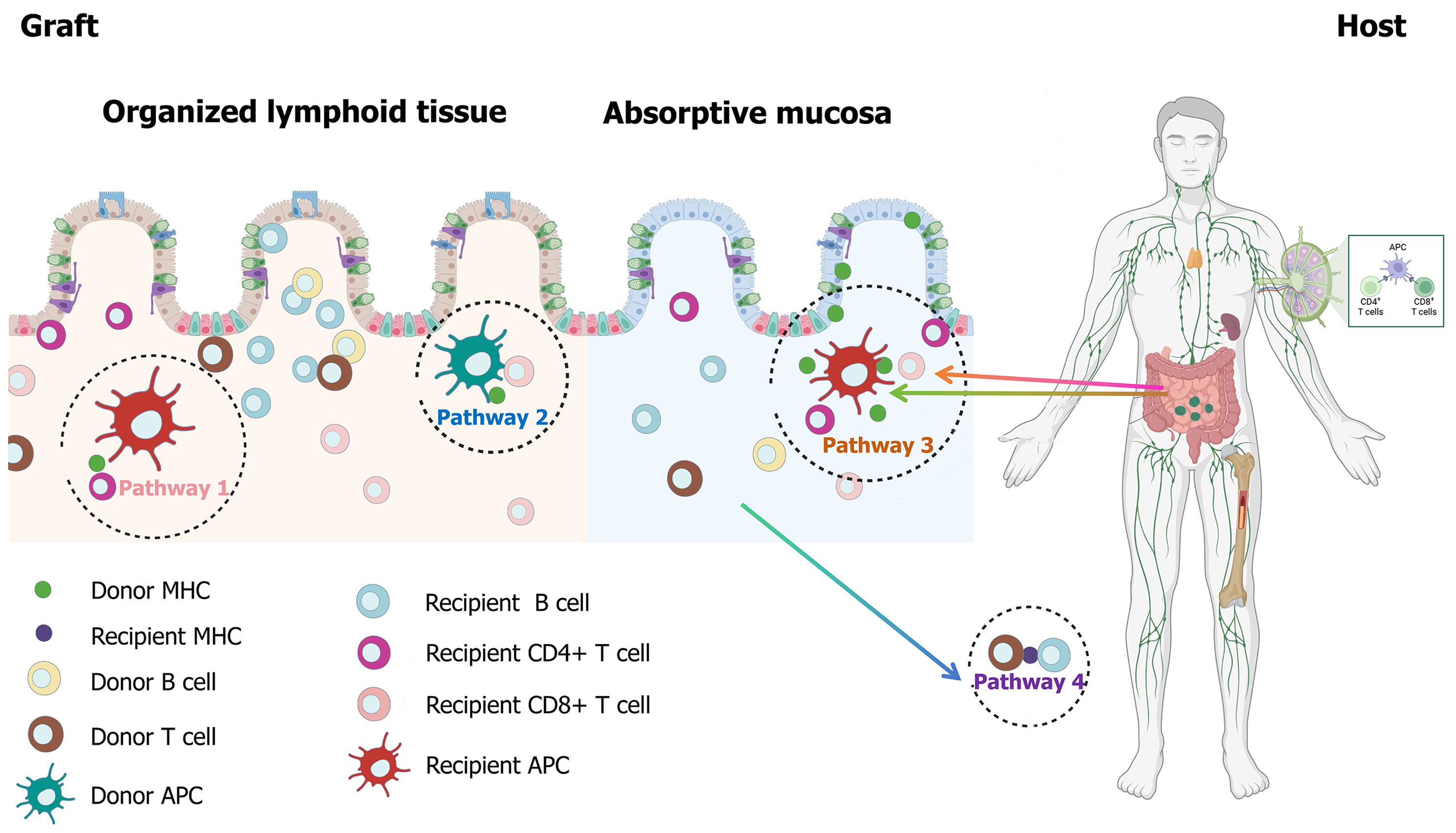 Immunological mechanisms of AR in ITx: AR after ITx is driven by a convergence of multiple allorecognition pathways, forming an intricate and partially redundant immunological network (Figure 2). The direct pathway dominates the early phase of AR, where donor antigen-presenting cells (APCs) directly activate recipient CD8+ and CD4+ T cells via donor MHC molecules. This leads to the generation of cytotoxic T lymphocytes (CTLs) and the release of pro-inflammatory cytokines, exacerbating epithelial injury and crypt apoptosis[138,139]. In parallel, the indirect pathway, where recipient APCs process and present donor antigens, promotes CD4+ T cell activation and facilitates the development of DSAs via B cell differentiation-central to CR and AMR[140]. The semi-direct pathway is mediated by donor-derived vesicles or apoptotic fragments containing intact MHC-peptide complexes, which are transferred to recipient APCs. This dual-mode recognition simultaneously activates T cells and promotes humoral sensitization[141-143]. A fourth route, the inverted direct pathway, involves donor CD4+ T cells directly stimulating recipient B cells, accelerating the formation of DSAs and potentially contributing to early-stage rejection not effectively controlled by T cell-targeted immunosuppression[144]. DSAs are identified in approximately 30% of ITx rejection episodes and mediate injury through complement-dependent cytotoxicity (CDC) and ADCC[74]. In CDC, DSAs initiate the classical complement cascade via C1q binding, forming membrane attack complexes that disrupt graft endothelial integrity. In ADCC, DSAs engage Fcγ receptors on NK cells or macrophages, triggering targeted destruction of the graft epithelium[145,146]. Importantly, preformed high-titer DSAs are predictive of AR within the first year post-transplant[147], and their persistent presence can provoke thrombotic microangiopathy through sustained endothelial activation and microvascular injury[148]. Collectively, these findings support the model where the direct pathway primarily drives early AR, while the indirect and semi-direct pathways underpin chronic and late-stage immune responses[149]. Nevertheless, the overlap and synergy among these pathways challenge the efficacy of conventional immunosuppressive regimens.