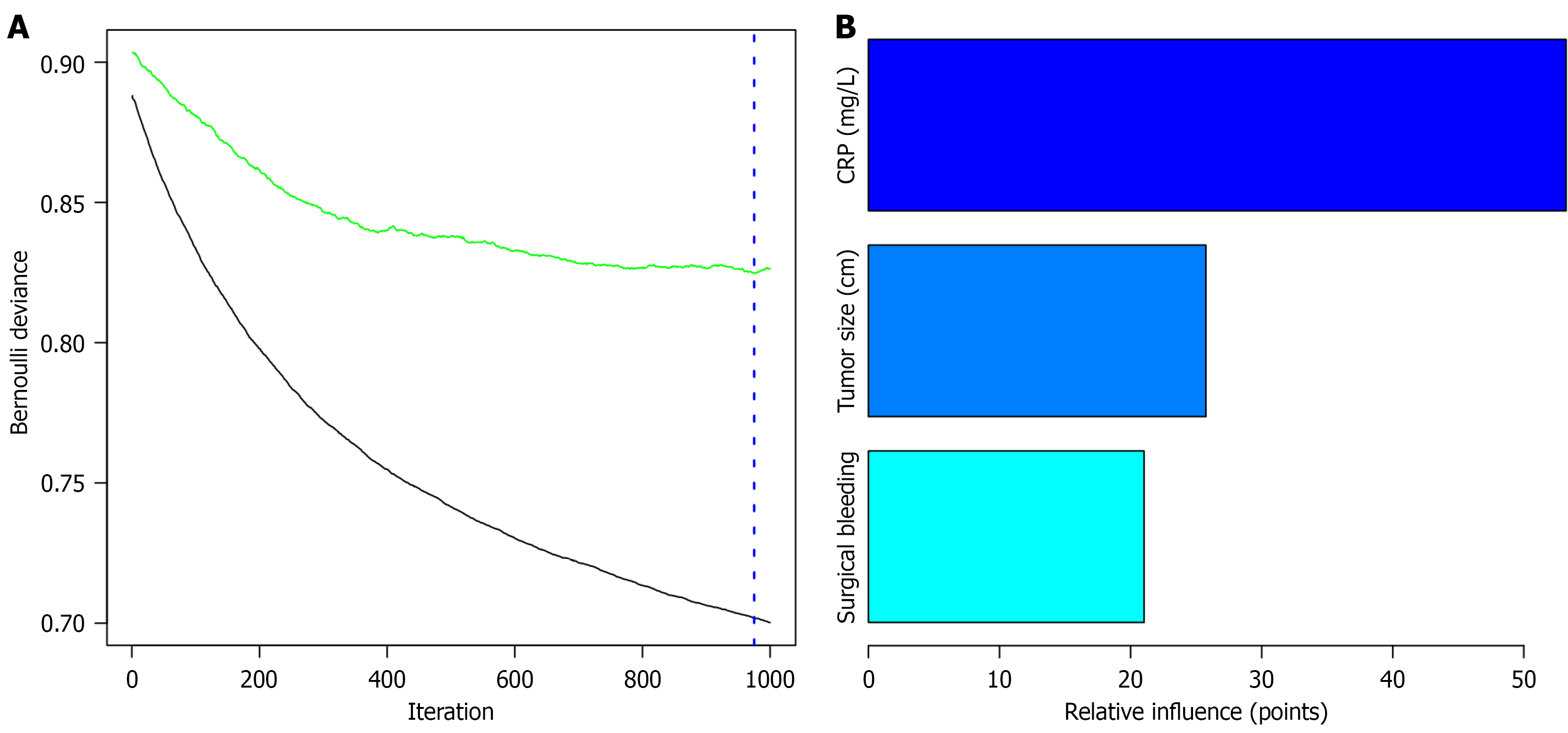 Variables with P < 0.05 (Table 4) were included in the GBM model. Using the 5-fold cross-validation method, the shrinkage was set to 0.005, and the initial iteration number was set to 1000 to train the model to obtain the optimal iteration number, that is, when n.trees = 975, the model had the smallest generalization error (Figure 1A). The relative importance of the variables was determined using the GBM algorithm as follows: CRP > tumor size > surgical bleeding (Figure 1B).