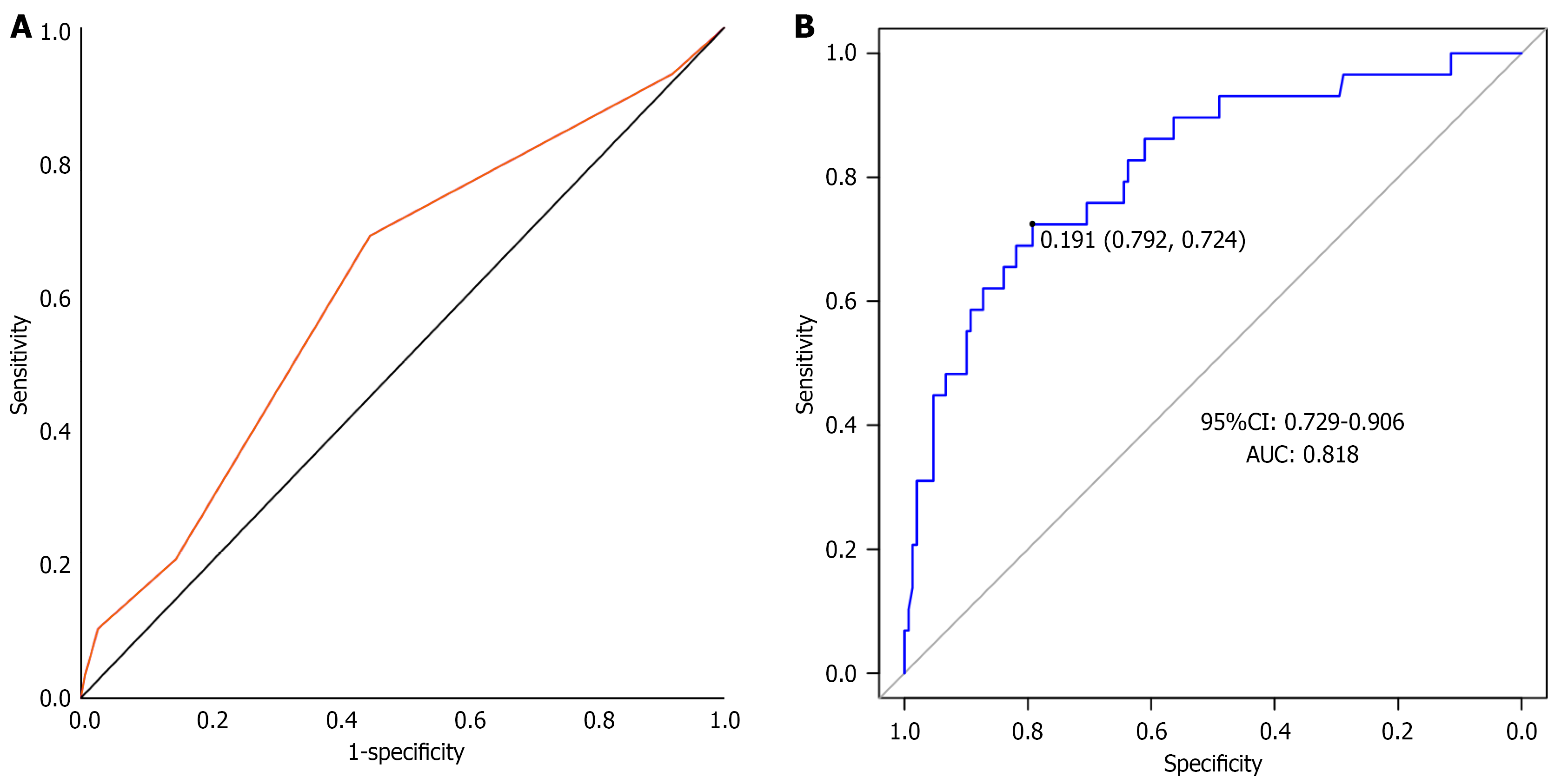 The results of the ROC curve analysis showed that the area under the curve (AUC) of the GBM prediction model was 0.818 (95%CI: 0.729-0.906), the sensitivity and specificity were 72.40% and 79.20%, respectively, and the optimal cut-off value was 0.191. The AUC of BEST-J score was 0.653 (95%CI: 0.545-0.762), the sensitivity and specificity were 69.00% and 59.73%, respectively, and the best cut-off value was 1.50. The Delong test showed that the GBM prediction model was superior to the BEST-J score (P < 0.05; Figure 2, Table 5).