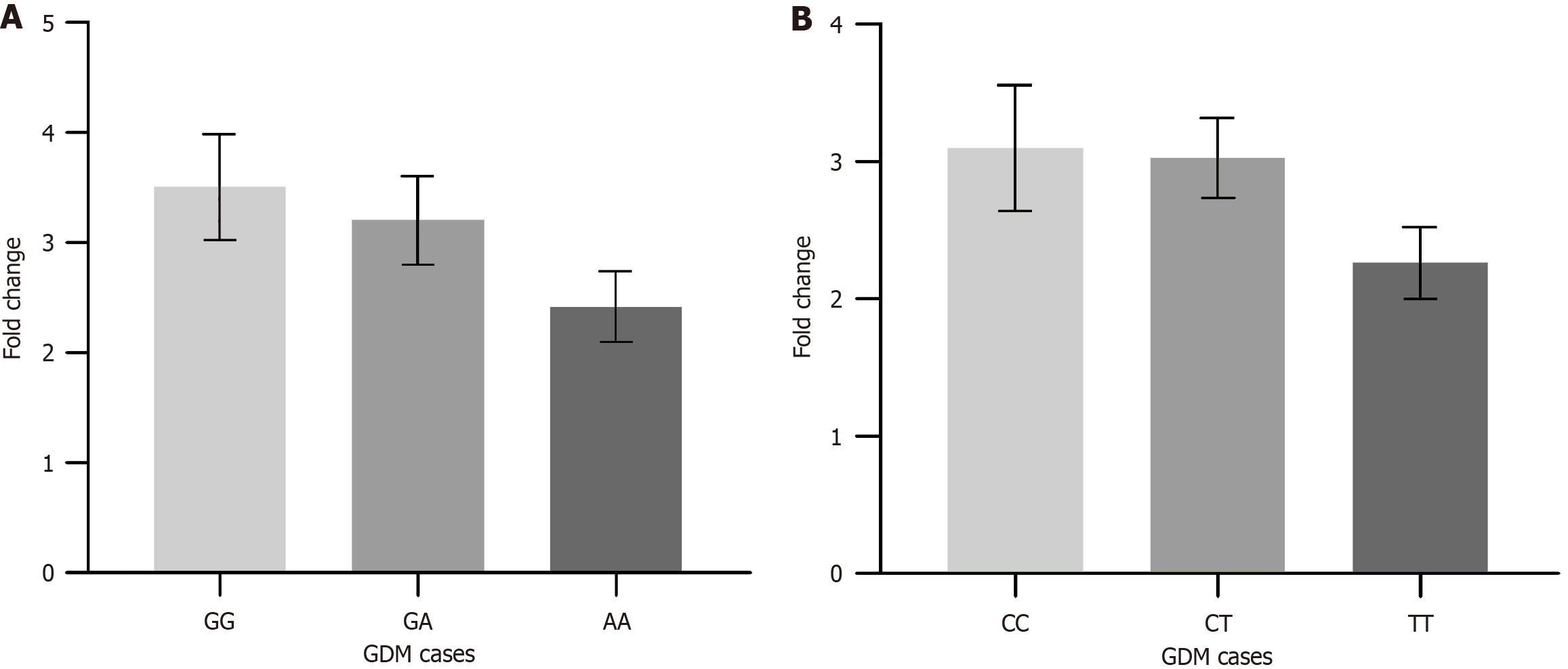 A: CD36 rs1761667 (G/A); B: Rs75326924 (C/T). GDM: Gestational diabetes mellitus.