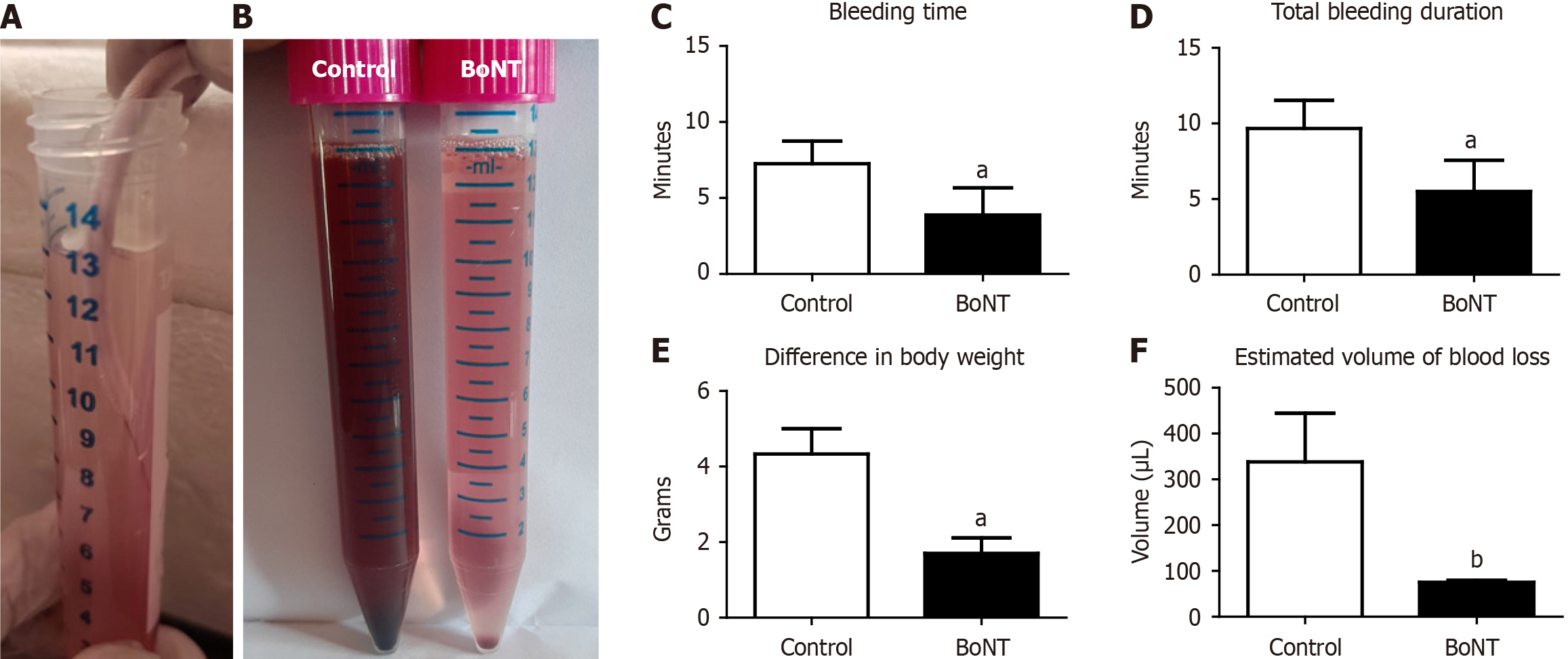 A: Representative image of bleeding assay during the tail tip amputation of an experimental mouse; B: The differences in the blood loss from the tail tip cut of a control and Botulinum toxin (BoNT)-treated mouse in the prewarmed saline containing tubes; C: Tail bleeding time; D: Total bleeding duration; E: Difference in body weight before and after the tail bleeding assay; F: The estimated volume of blood loss in control and BoNT-treated animals. aP value ≤ 0.01, bP value ≤ 0.001. BoNT: Botulinum toxin.