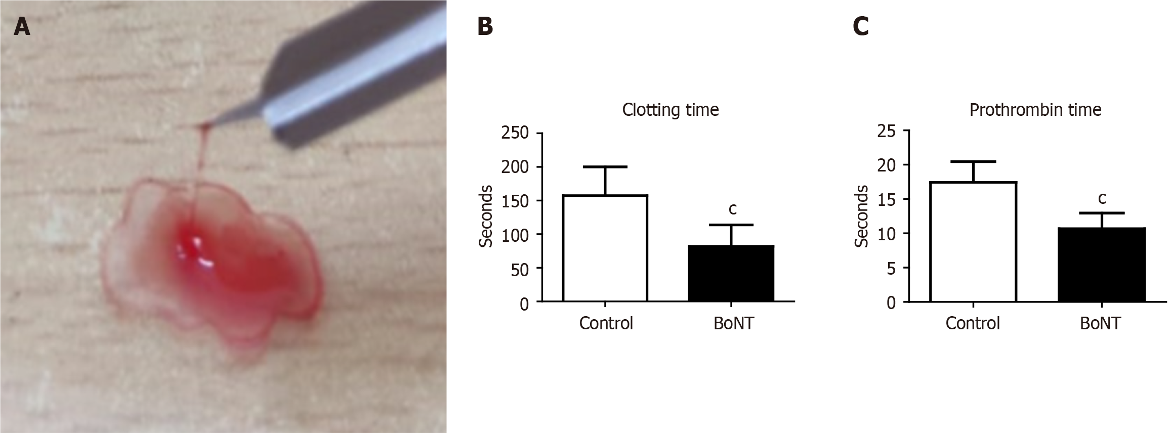 A: Representative image for the appearance of the fibrin thread on the glass slide as the estimation of the clotting time; B: Clotting time in the control and Botulinum toxin (BoNT)-treated animals; C: Prothrombin time in the control and BoNT-treated animals. cP value ≤ 0.01. BoNT: Botulinum toxin.