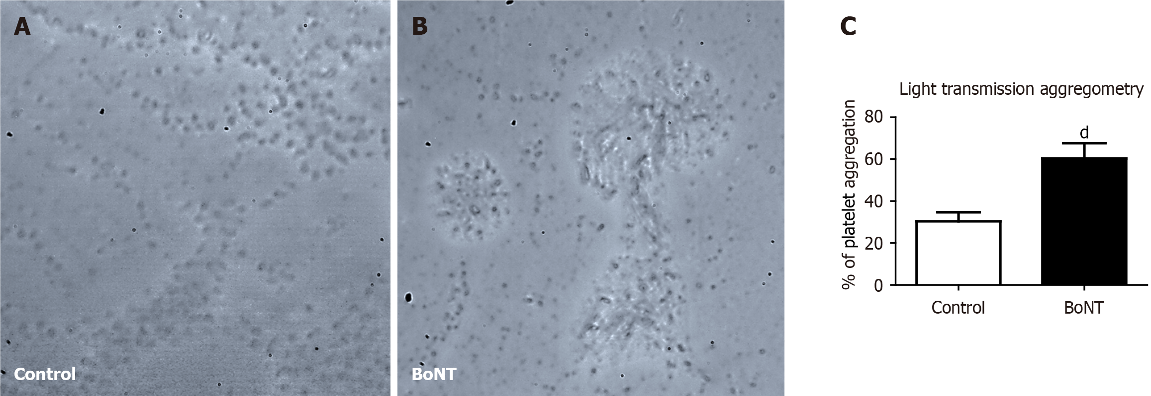 A: Phase contrast microscopic images of aggregation of platelets obtained from platelet-rich plasma (PRP) of control; B: Phase contrast microscopic images of aggregation of platelets obtained from PRP of Botulinum toxin (BoNT)-treated animals; C: The bar graph data represents the percentage of platelet aggregation in control and BoNT-treated animals. dP value ≤ 0.01. BoNT: Botulinum toxin.