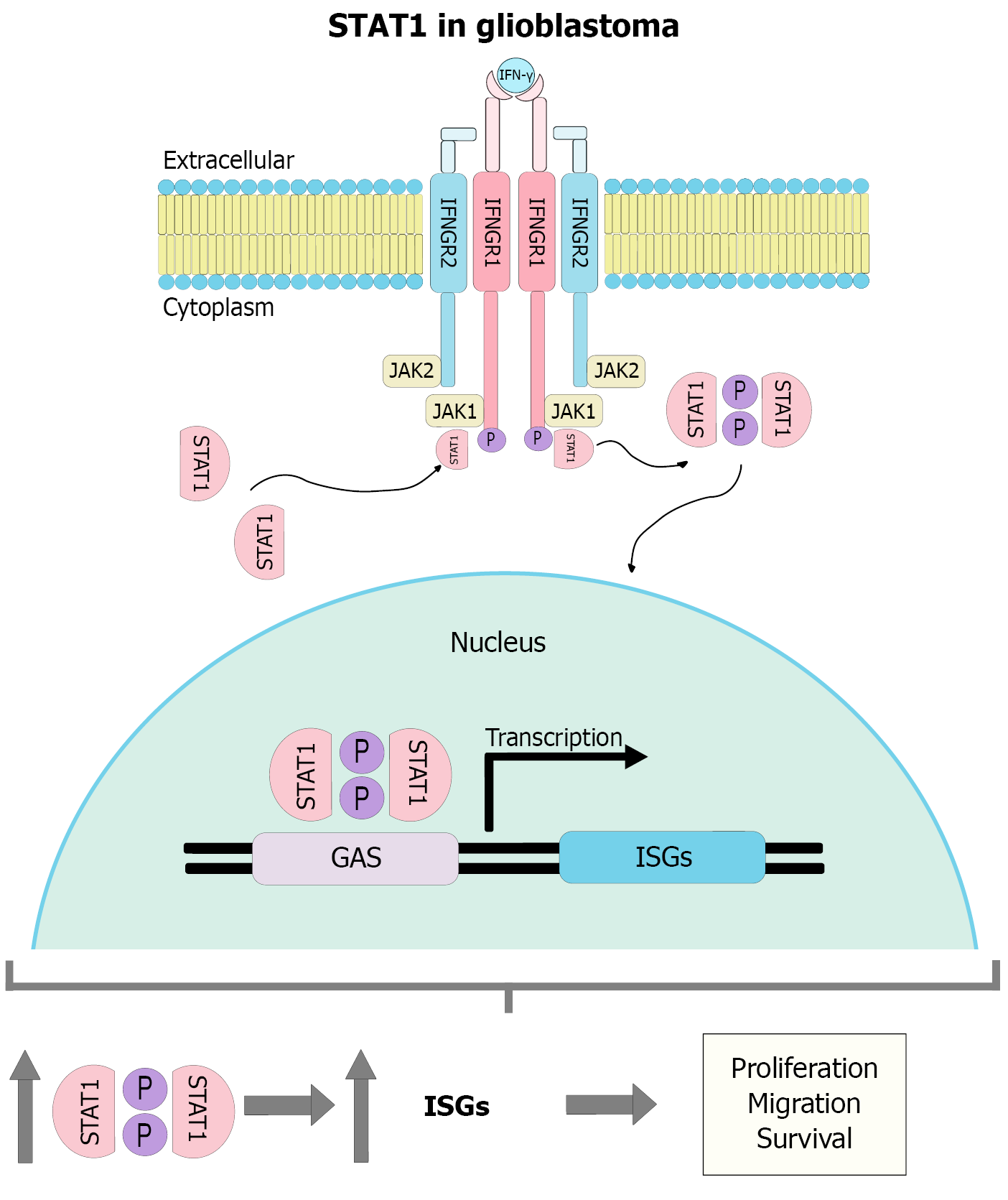 The binding of interferon-gamma to its heterotetrameric receptor, composed of two dimers of IFNGR1 and IFNGR2, activates the Janus kinases 1 and 2, which leads to the phosphorylation and activation of the signal transducer and activator of transcription 1 (STAT1). Once phosphorylated, STAT1 forms dimers that translocate to the nucleus, where it binds to gamma-activated sequence elements in the promoters of interferon-stimulated genes, promoting their transcription. Sustained activation of this pathway induces the transcription of genes involved in cell proliferation, migration, and survival, contributing to the aggressive phenotype of glioblastoma. GAS: Gamma-activated sequences; STAT1: Signal transducer and activator of transcription 1; JAK1: Janus kinases 1; JAK2: Janus kinases 2; ISGs: Interferon-stimulated genes.