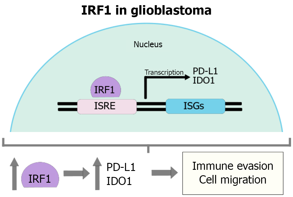 Interferon regulatory factor 1 protein has the molecular function of a transcription factor; through this mechanism, it can positively regulate the gene expression of programmed death-ligand 1 and indoleamine 2,3-dioxygenase 1, promoting immune evasion and cell migration. IRF1: Interferon regulatory factor 1; PD-L1: Programmed death-ligand 1; IDO1: Indoleamine 2,3-dioxygenase 1; ISRE: Interferon-stimulated response element.