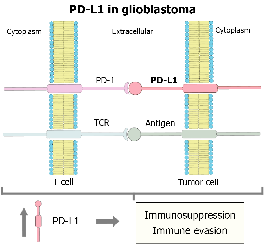 Glioblastoma tumor cells can evade the immune response through the overexpression of programmed death-ligand 1 on their surface. This ligand binds to the programmed cell death protein 1 receptor present on T cells, inhibiting T cell receptor-mediated signaling, even in the presence of tumor antigens. As a result, T cells are not properly activated, promoting an immunosuppressive microenvironment that allows tumor progression. This regulatory axis represents a critical point in glioblastoma immune evasion. PD-L1: Programmed death-ligand 1; TCR: T cell receptor; PD-1: Programmed cell death protein 1.