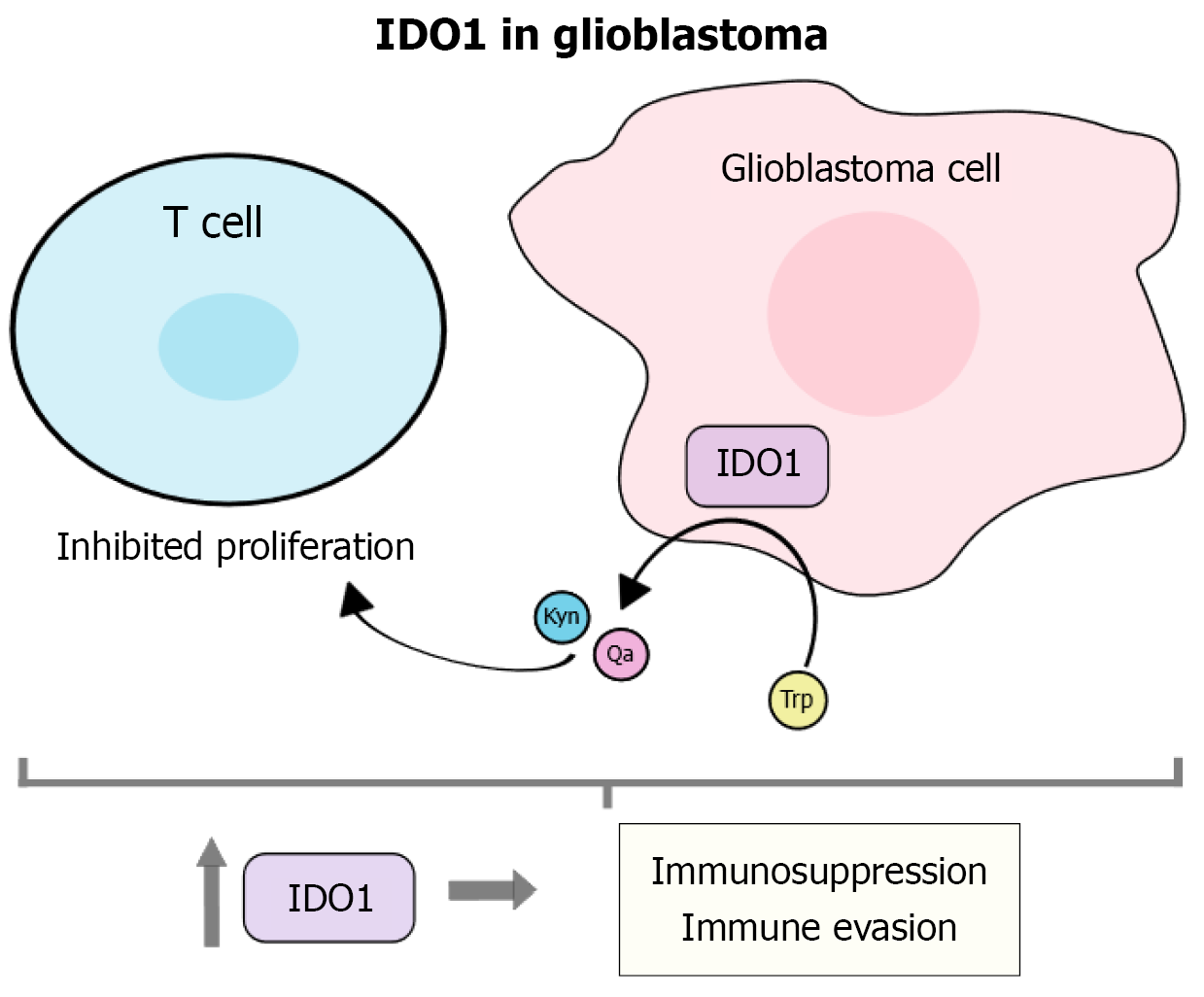 Indoleamine 2,3-dioxygenase 1 is involved in the degradation of tryptophan into kynurenine and other toxic metabolites such as quinolinic acid; these metabolites function to suppress T-cell proliferation, thereby creating an immunosuppressed environment in glioblastoma. IDO1: Indoleamine 2,3-dioxygenase 1.