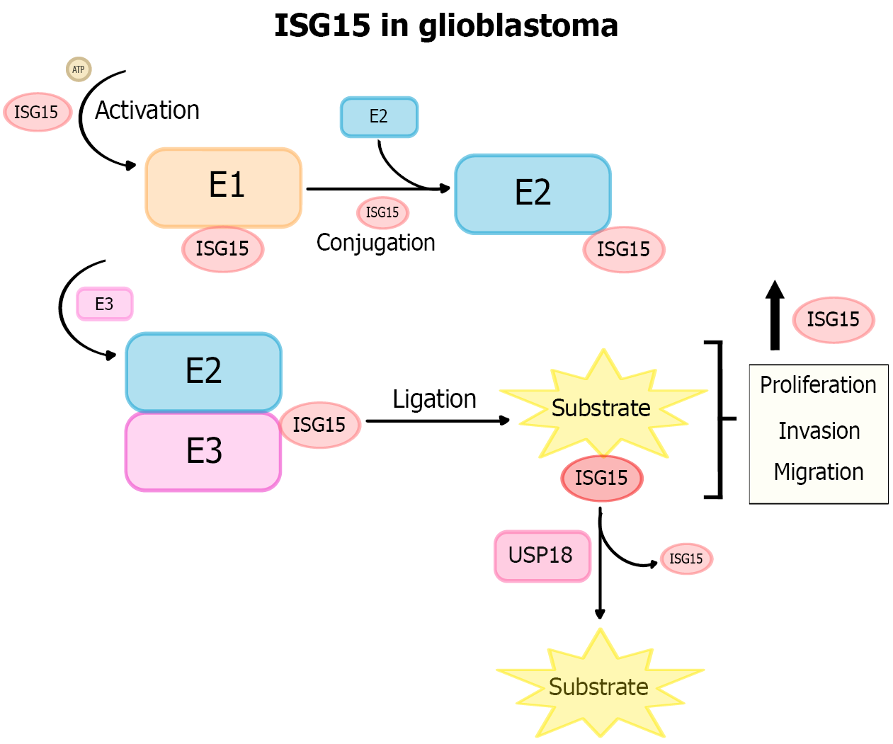 Interferon-stimulated gene 15 (ISG15) carries out its function through a post-translational modification similar to ubiquitination, known as ISGylation, which involves three steps: Activation, conjugation, and ligation of ISG15 to its target. The figure shows that this post-translational modification is reversible by ubiquitin-specific protease 18. ISG15 can be found both free and conjugated to its substrate, and, in the context of glioblastoma, it functions to enhance proliferation, migration, and invasion. ISG15: Interferon-stimulated gene 15; USP18: Ubiquitin-specific protease 18.