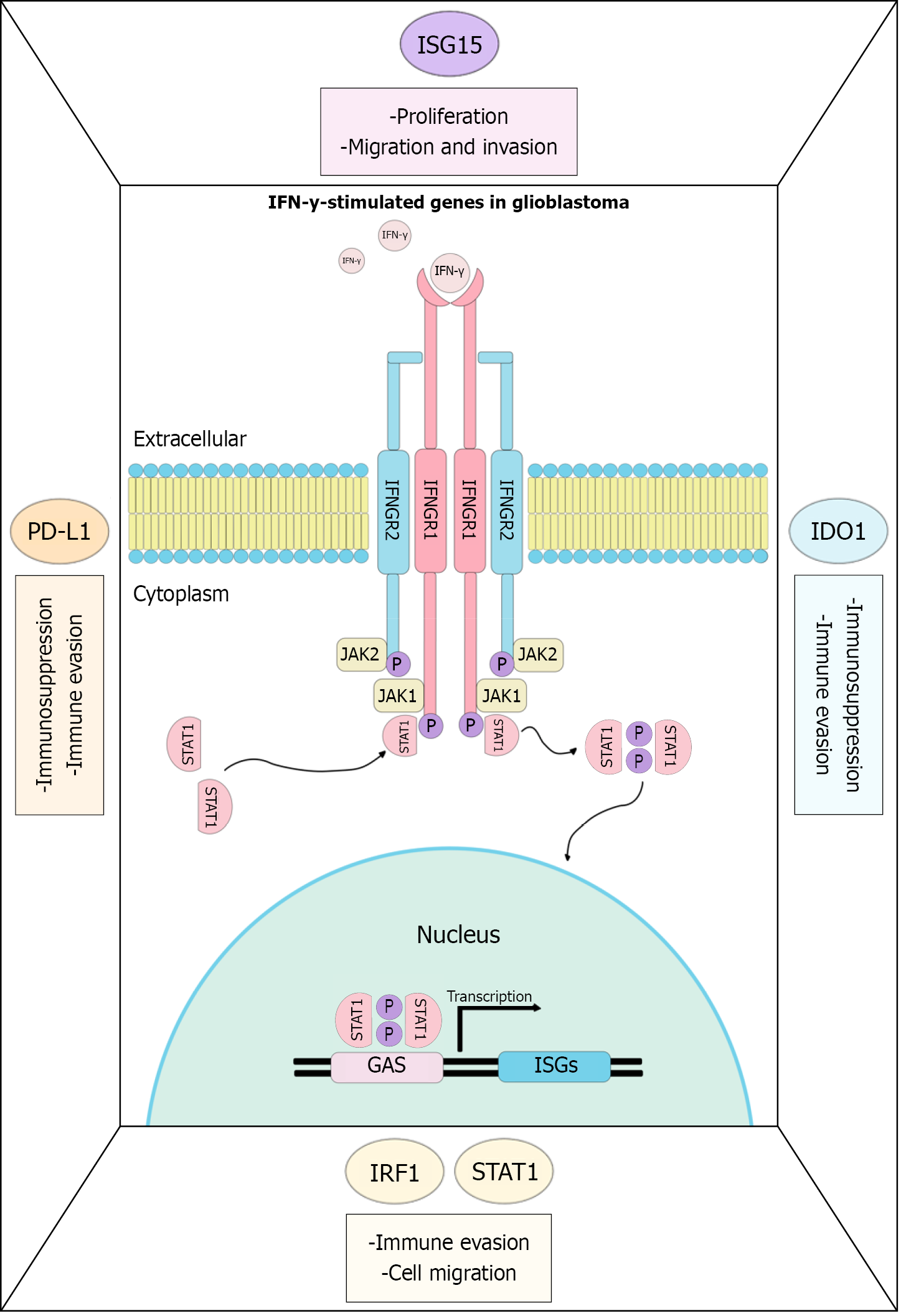 The binding of interferon-gamma to its receptor activates the Janus kinase/signal transducer and activator of transcription 1 (STAT1) pathway, promoting the transcription of interferon-stimulated genes. In glioblastoma, this activation is associated with the overexpression of genes such as programmed death-ligand 1 (PD-L1), indoleamine 2,3-dioxygenase 1 (IDO1), interferon regulatory factor 1 (IRF1), interferon-stimulated gene 15 (ISG15), and STAT1, which contribute to the establishment of an immunosuppressive and aggressive tumor microenvironment. PD-L1 and IDO1 promote immune evasion, while IRF1 is associated with poor survival. Meanwhile, STAT1 and ISG15 are linked to processes of cell proliferation, migration, and invasion, all of which are related to an aggressive tumor. PD-L1: Programmed death-ligand 1; ISG15: Interferon-stimulated gene 15; IRF1: Interferon regulatory factor 1; STAT1: Signal transducer and activator of transcription 1; JAK: Janus kinase; IFN-γ: Interferon-gamma; IDO1: Indoleamine 2,3-dioxygenase 1.