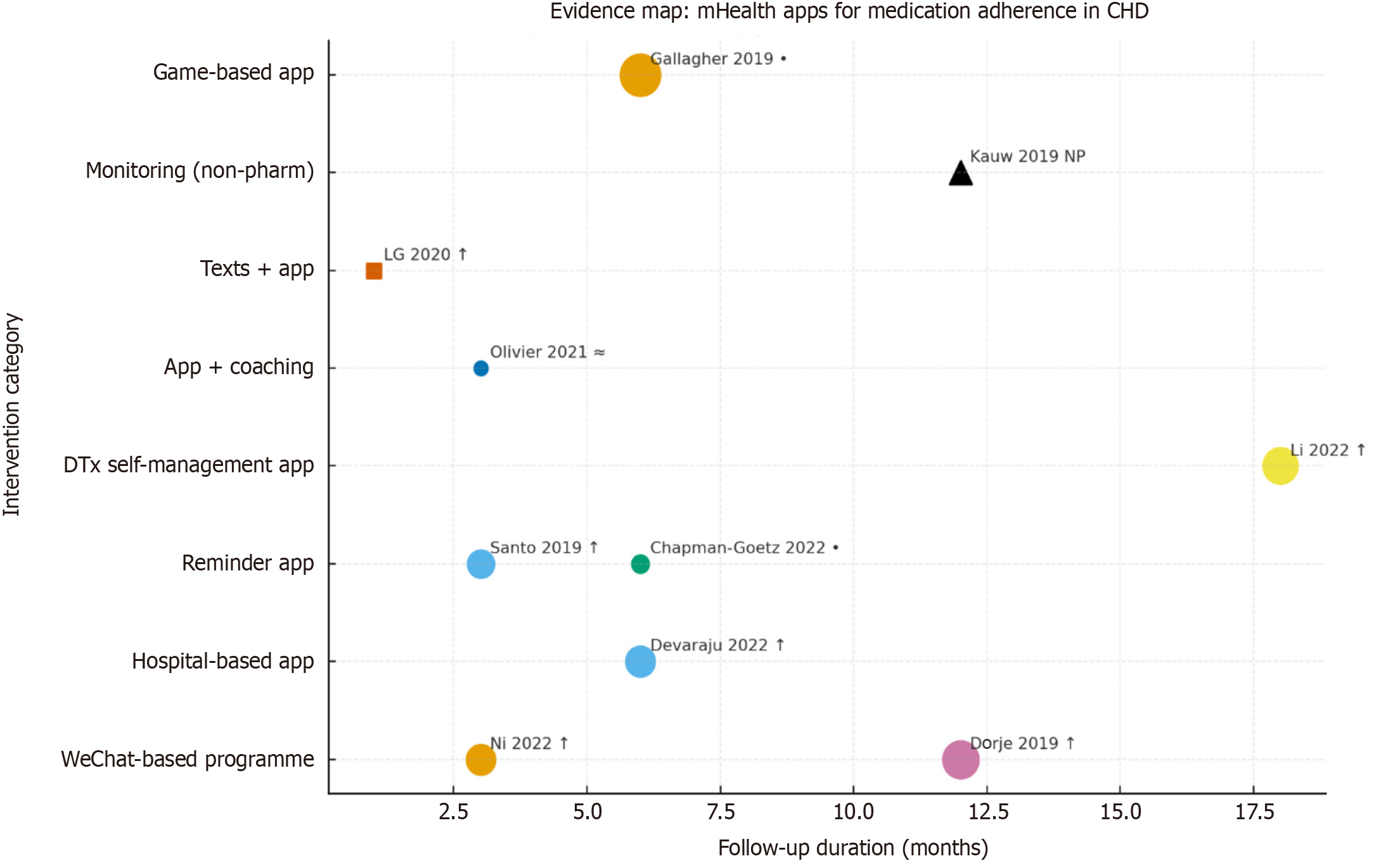 Follow-up on X-axis, intervention category on Y-axis; bubble size represents total sample; shape represents design; annotation represents author-year + outcome. CHD: Congenital heart disease; DTx: Digital therapeutics; mHealth: Mobile health.