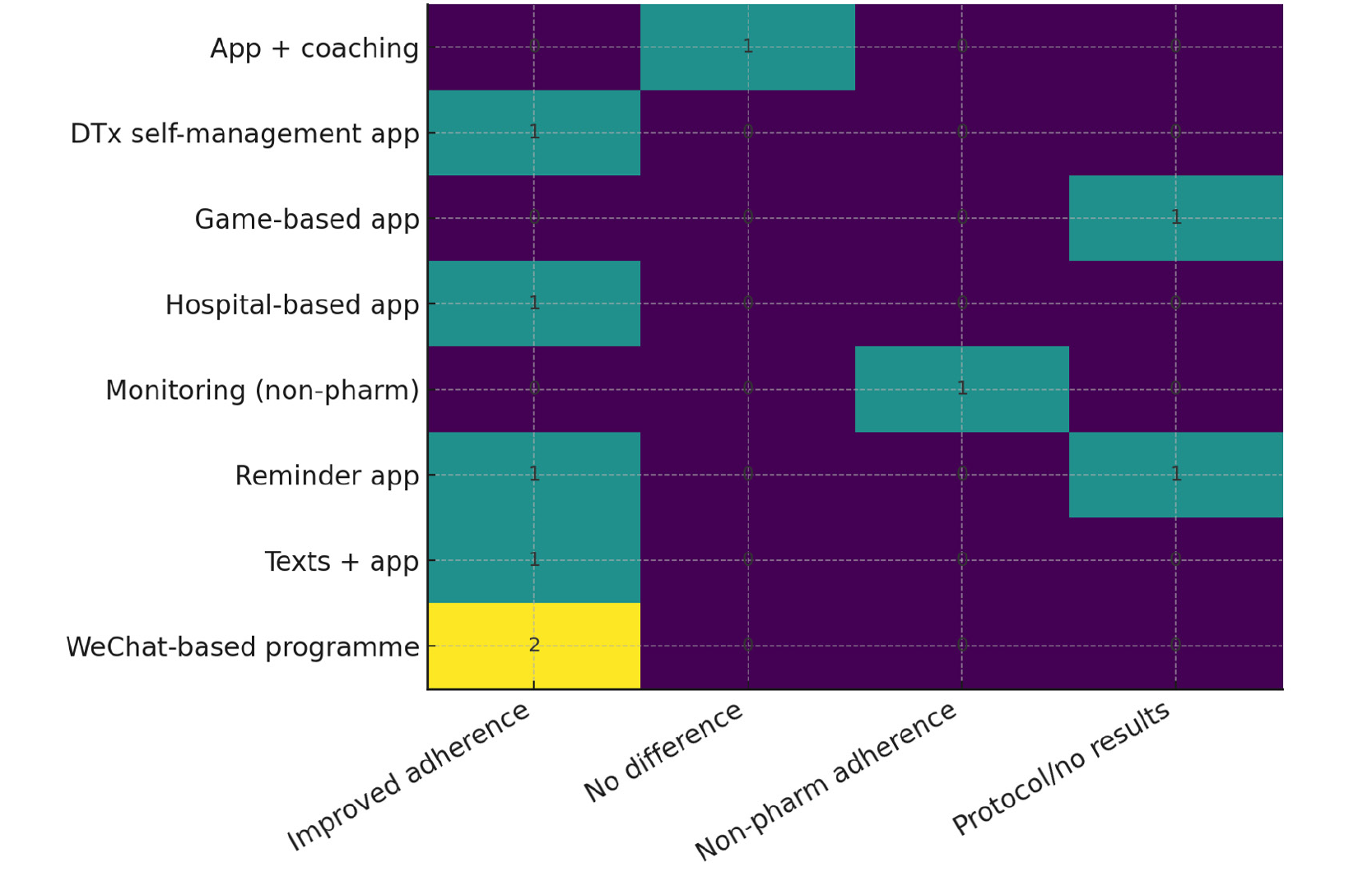 Figure 3 Evidence matrix heatmap (intervention category × outcome category, with counts).