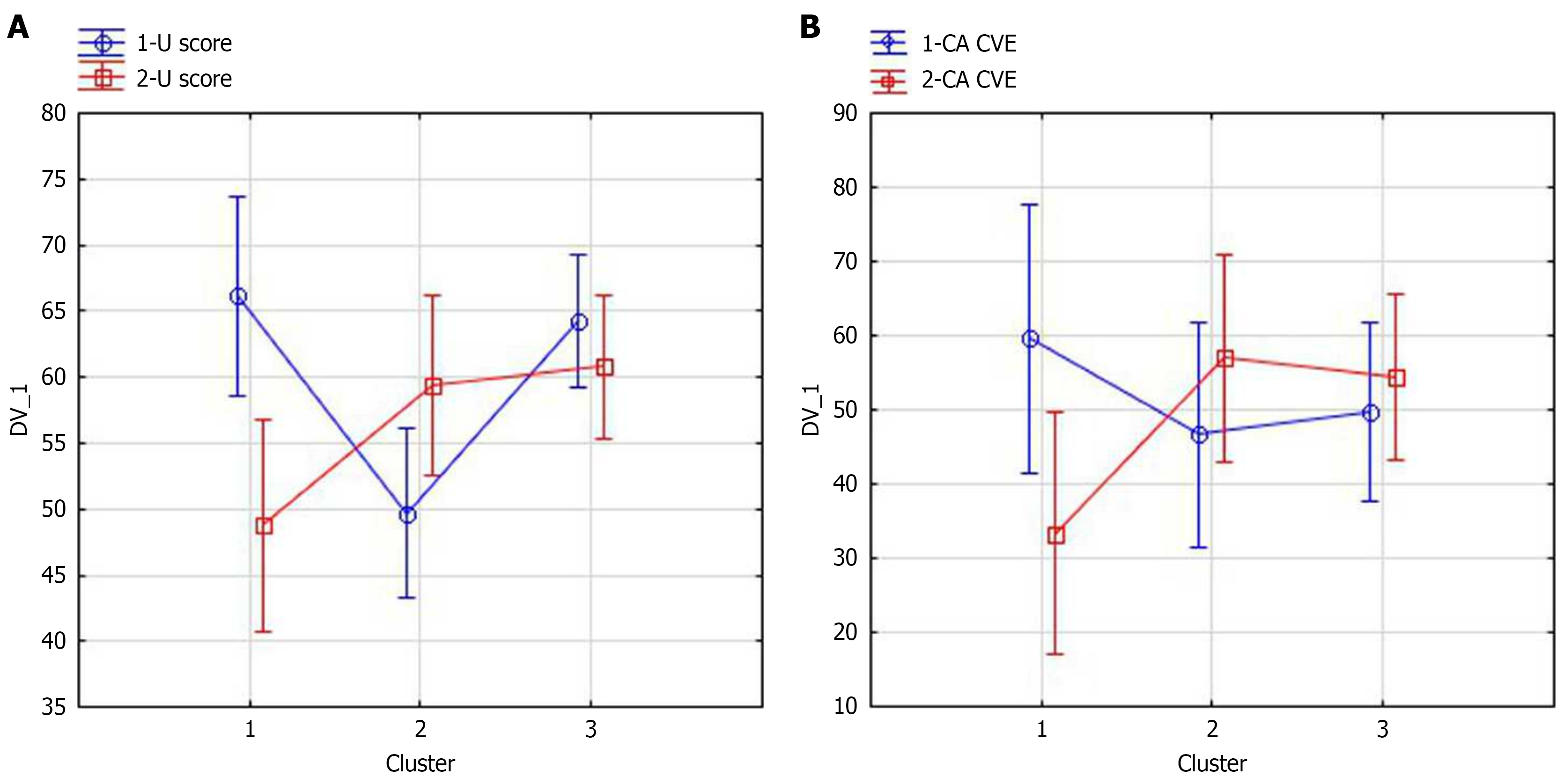 A: Uscore; B: Complex serious cardiovascular events risk assessment. 1-Uscore: Uscore index values prior stunting, 2-Uscore: After stunting; 1-CA CVE: Prior to the stenting “Complex serious cardiovascular events risk assessment” (blue); 2-CA CVECVE: After the stenting “Complex serious cardiovascular events risk assessment” (red).
