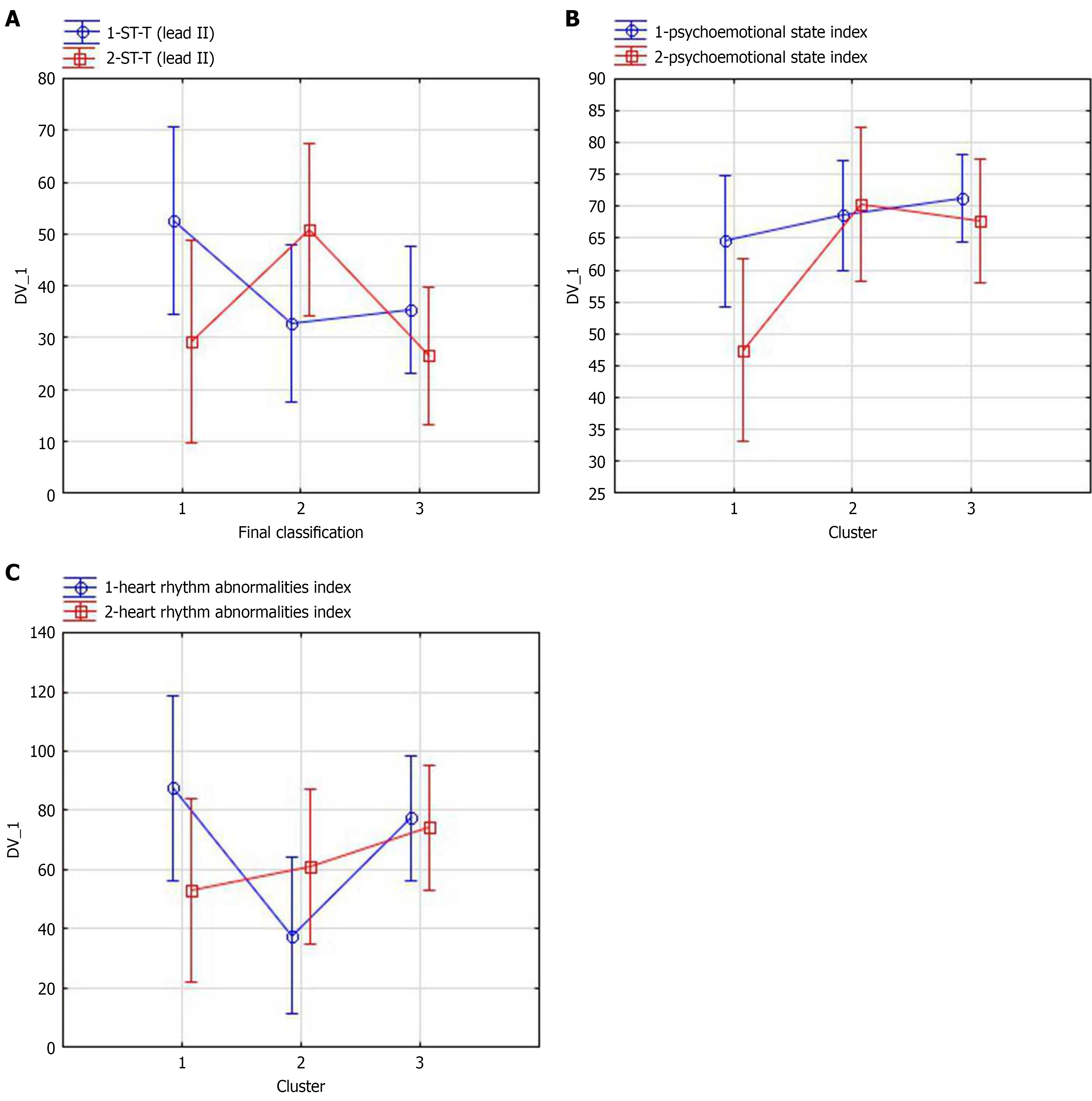 A: Changes of integral characteristic of interval ST-T shape in lead II; 1-ST-T (lead II): Prior to the stenting integral characteristic of interval ST-T shape in lead II; 2-ST-T (lead II): After the stenting integral characteristic of interval ST-T shape in lead II; B: Psychoemotional state; C: Heart rhythm abnormalities.