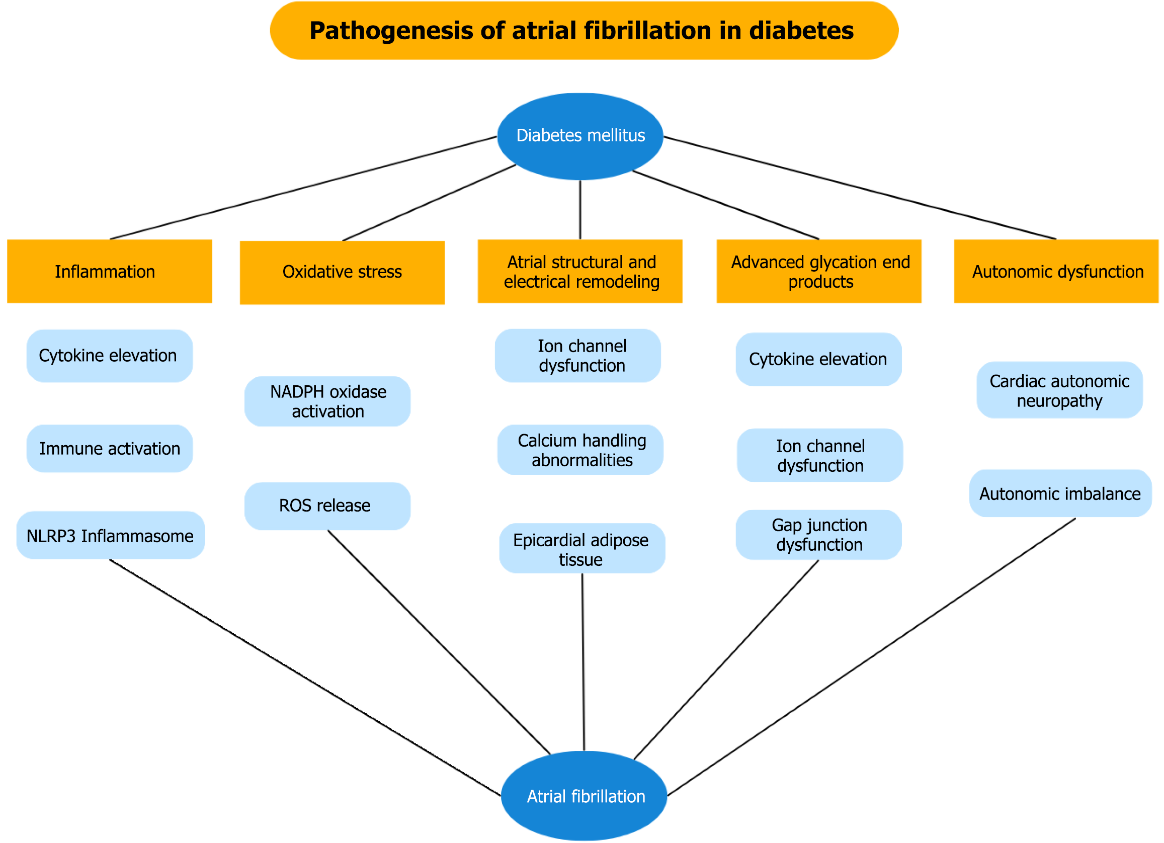 Diabetes mellitus increases atrial fibrillation risk through multiple inter connected pathways, including inflammation, oxidative stress, atrial structural and electrical remodeling, accumulation of advanced glycation end products and autonomic dysfunction. These processes involve cytokine elevation, ion channel and calcium-handling abnormalities, reactive oxygen species release and cardiac autonomic neuropathy, ultimately promoting atrial arrhythmogenesis. NLRP3: NOD-like receptor pyrin domain containing the 3; ROS: Reactive oxygen species.