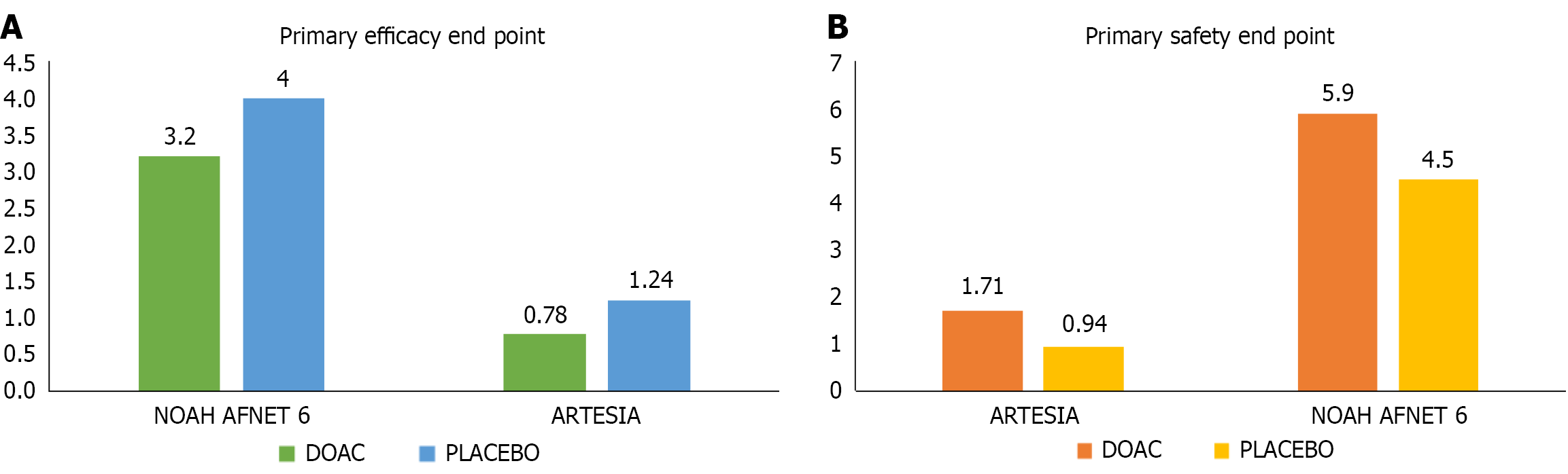 A: The primary efficacy outcome; B: The primary safety endpoint. The primary efficacy endpoint in the ARTESIA study was a composite of stroke/systemic embolism (SE), while in the NOAH AFNET-6 was cardiovascular death, stroke, or SE. The y axis represents the event rate measured in person-years. Similarly, major bleeding was the primary safety endpoint in ARTESIA, while in the NOAH-AFNET study, it was a combination of all-cause death or major bleeding. DOAC: Direct oral anticoagulant.