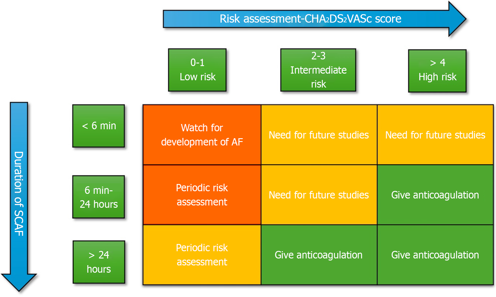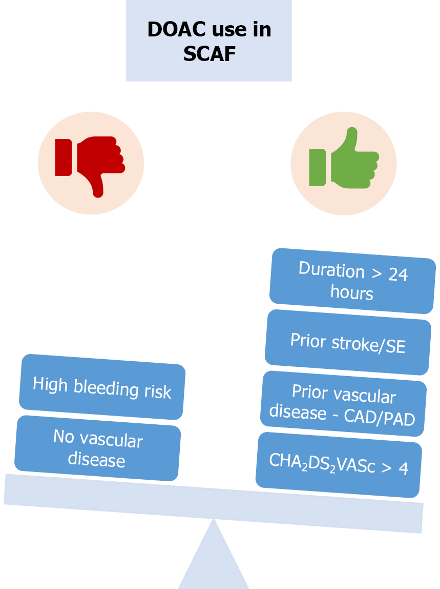 The green colour indicated factors favouring direct oral anticoagulation (DOAC) use in subclinical atrial fibrillation, while the red colour represents factors arguing against DOAC therapy. The CHA2DS2-VASc score is used to predict the risk of ischemic stroke among patients with atrial fibrillation and ranges from 0 to 9, with higher scores indicating a greater risk of stroke. SCAF: Subclinical atrial fibrillation; CAD: Coronary artery disease; PAD: Peripheral artery disease; DOAC: Direct oral anticoagulation; CHA2DS2-VASc score: Congestive heart failure, hypertension, age ≥ 75 years (2 points), diabetes mellitus, prior stroke or TIA or thromboembolism (2 points), vascular disease, age 65-74 years, sex category.