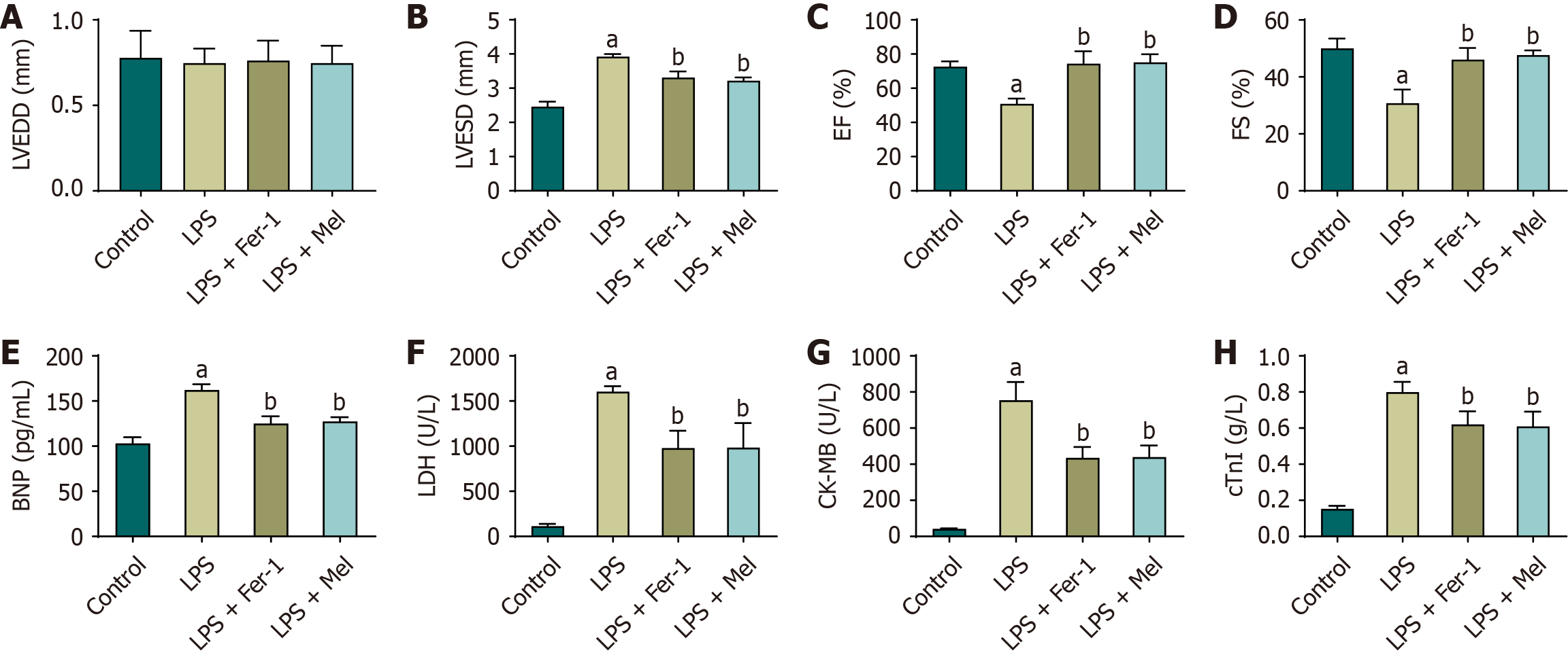 A-D: Echocardiography 24 hours after lipopolysaccharide injection: Left ventricular end-diastolic diameter (A); left ventricular end-systolic diameter (B); ejection fraction (C); and fractional shortening (D); E-H: Serum cardiac injury markers: Brain natriuretic peptide (E); lactate dehydrogenase (F); creatine kinase-MB (G); and cardiac troponin I (F). Data are expressed as mean ± SD; n = 6 mice per group. Group differences were analyzed using one-way analysis of variance with Bonferroni post-hoc testing. aP < 0.01 vs control; bP < 0.01 vs lipopolysaccharide. BNP: Brain natriuretic peptide; CK-MB: Creatine kinase-MB; cTnI: Cardiac troponin I; EF: Ejection fraction; FS: Fractional shortening; LDH: Lactate dehydrogenase; LPS: Lipopolysaccharide; LPS + Mel: Lipopolysaccharide plus melatonin; LPS + Fer-1: Lipopolysaccharide plus ferrostatin-1; LVEDD: Left ventricular end-diastolic diameter; LVESD: Left ventricular end-systolic diameter.