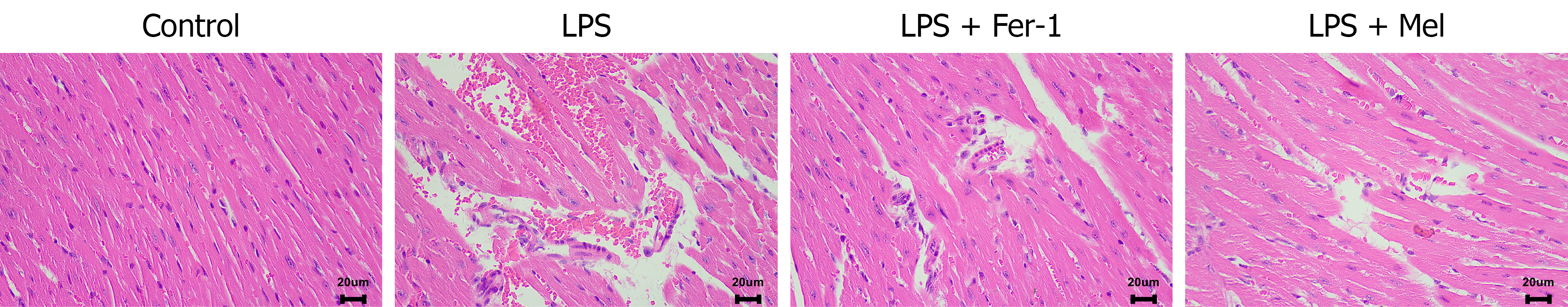 Representative hematoxylin and eosin-stained myocardial sections from control, lipopolysaccharide (LPS), LPS plus ferrostatin-1, and LPS plus melatonin groups 24 hours after LPS injection. The LPS group shows interstitial edema, hemorrhage/congestion, myofibrillar disruption, and inflammatory cell infiltration; these changes are attenuated in LPS plus ferrostatin-1 and LPS plus melatonin. Representative images from n = 6 mice per group; scale bar = 20 μm. LPS: Lipopolysaccharide; LPS + Mel: Lipopolysaccharide plus melatonin; LPS + Fer-1: Lipopolysaccharide plus ferrostatin-1.