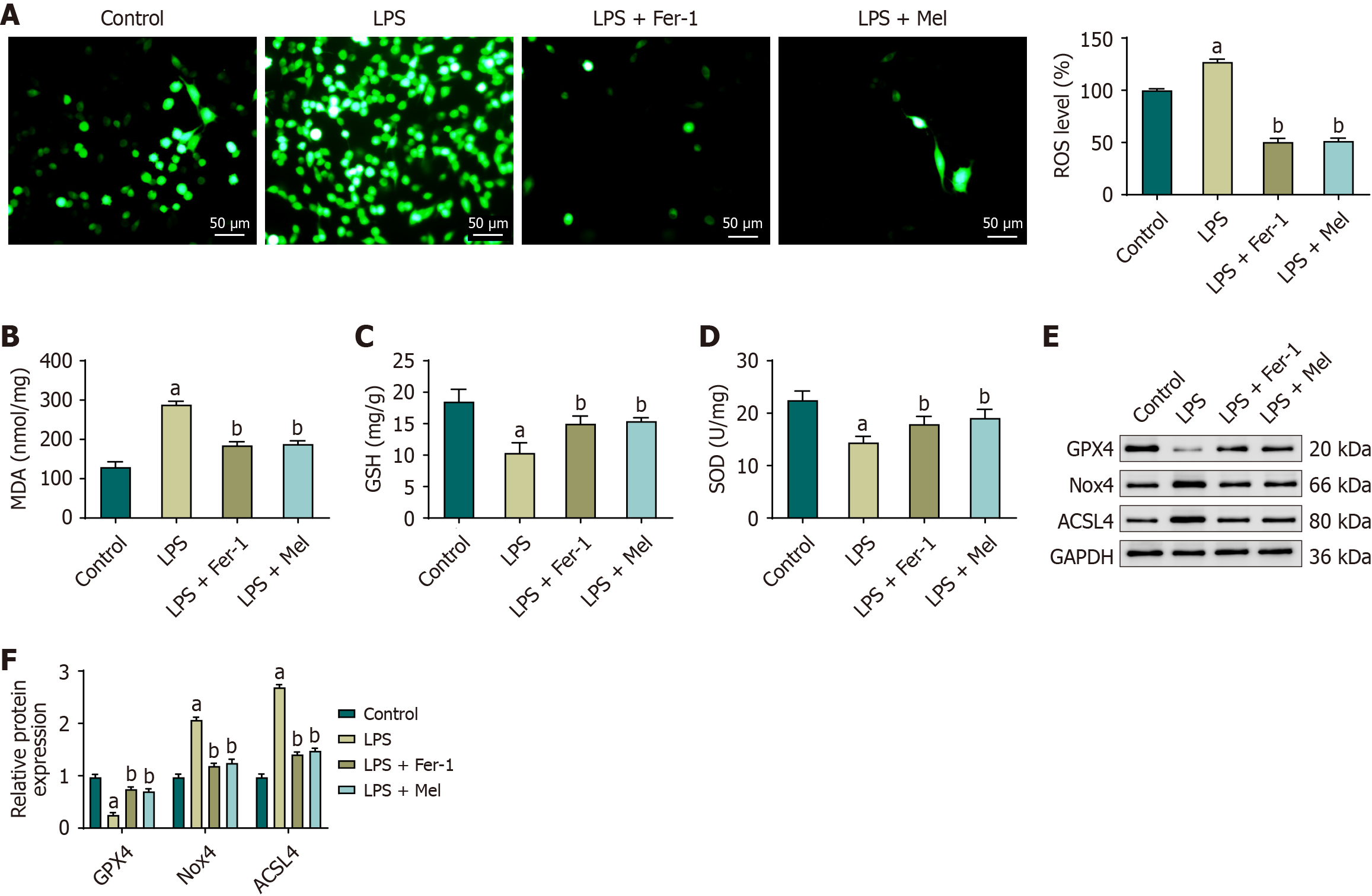 A: Myocardial reactive oxygen species measured by 2’,7’-dichlorodihydrofluorescein diacetate fluorescence microscopy with quantitative analysis; B-D: Cardiac malondialdehyde, glutathione, and superoxide dismutase activity; E: Representative immunoblots of glutathione peroxidase 4, NADPH oxidase 4, and acyl-CoA synthetase long-chain family member 4 in cardiac tissue (glyceraldehyde-3-phosphate dehydrogenase loading control); F: Densitometric quantification normalized to glyceraldehyde-3-phosphate dehydrogenase. Data are mean ± SD; n = 6 mice per group. One-way analysis of variance with Bonferroni post-hoc testing. aP < 0.01 vs control; bP < 0.01 vs lipopolysaccharide. ACSL4: Acyl-CoA synthetase long-chain family member 4; GAPDH: Glyceraldehyde-3-phosphate dehydrogenase; GPX4: Glutathione peroxidase 4; GSH: Glutathione; LPS: Lipopolysaccharide; LPS + Mel: Lipopolysaccharide plus melatonin; LPS + Fer-1: Lipopolysaccharide plus ferrostatin-1; MDA: Malondialdehyde; Nox4: NADPH oxidase 4; ROS: Reactive oxygen species; SOD: Superoxide dismutase.
