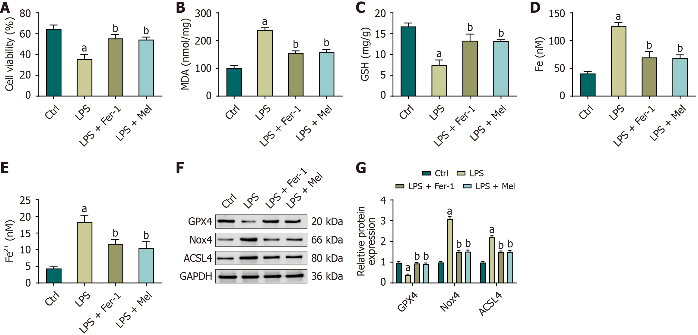 A: Cell viability assessed by cell counting kit-8; B-E: Cellular malondialdehyde, glutathione, total iron, and ferrous iron after treatment with lipopolysaccharide with or without ferrostatin-1 or melatonin; F: Representative immunoblots of glutathione peroxidase 4, NADPH oxidase 4, and acyl-CoA synthetase long-chain family member 4 (glyceraldehyde-3-phosphate dehydrogenase as control); G: Densitometric quantification normalized to glyceraldehyde-3-phosphate dehydrogenase. Data are presented as mean ± SD from three independent biological experiments (each measured in technical triplicate). One-way analysis of variance with Bonferroni post-hoc testing. aP < 0.01 vs control; bP < 0.01 vs lipopolysaccharide. ACSL4: Acyl-CoA synthetase long-chain family member 4; Ctrl: Control; Fe2+: Ferrous iron; GAPDH: Glyceraldehyde-3-phosphate dehydrogenase; GPX4: Glutathione peroxidase 4; GSH: Glutathione; LPS: Lipopolysaccharide; LPS + Mel: Lipopolysaccharide plus melatonin; LPS + Fer-1: Lipopolysaccharide plus ferrostatin-1; MDA: Malondialdehyde; Nox4: NADPH oxidase 4.