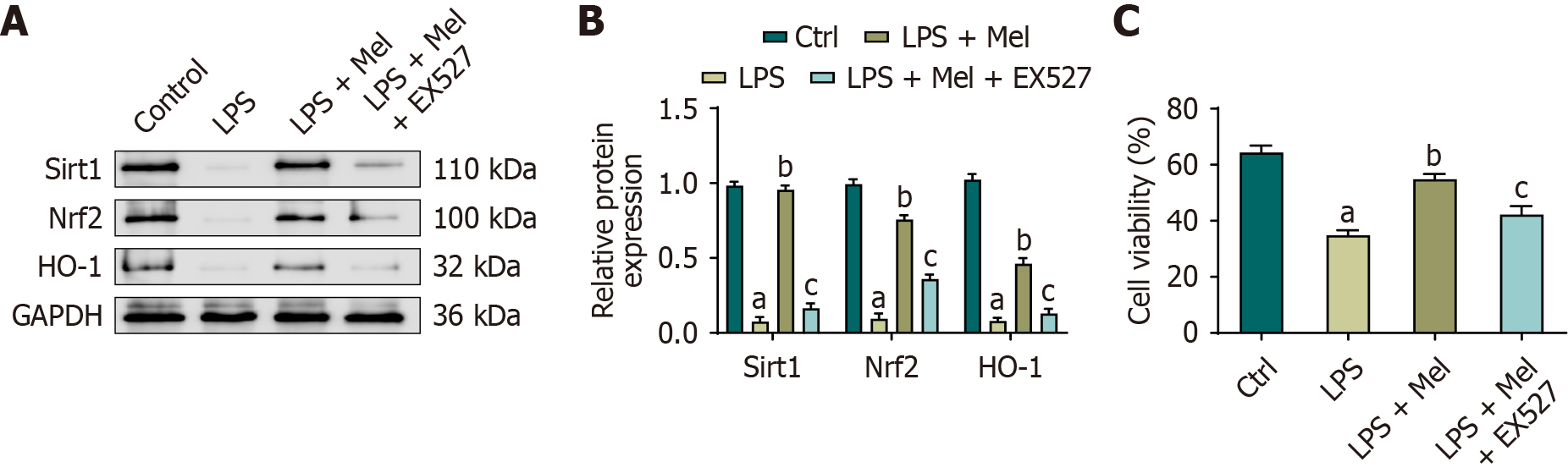 A and B: Representative immunoblots and quantification of sirtuin 1, nuclear factor erythroid 2-related factor 2, and heme oxygenase-1 in HL-1 cells treated with lipopolysaccharide, melatonin, or melatonin plus the sirtuin 1 inhibitor EX527 (glyceraldehyde-3-phosphate dehydrogenase as control); C: Cell viability assessed by cell counting kit-8 under the same conditions. Data are presented as mean ± SD from three independent biological experiments (each measured in technical triplicate). One-way analysis of variance with Bonferroni post-hoc testing. aP < 0.01 vs control; bP < 0.01 vs lipopolysaccharide; cP < 0.01 vs lipopolysaccharide plus melatonin. Ctrl: Control; GAPDH: Glyceraldehyde-3-phosphate dehydrogenase; HO-1: Heme oxygenase-1; LPS: Lipopolysaccharide; LPS + Mel: Lipopolysaccharide plus melatonin; LPS + Fer-1: Lipopolysaccharide plus ferrostatin-1; Nrf2: Nuclear factor erythroid 2-related factor 2; Sirt1: Sirtuin 1.