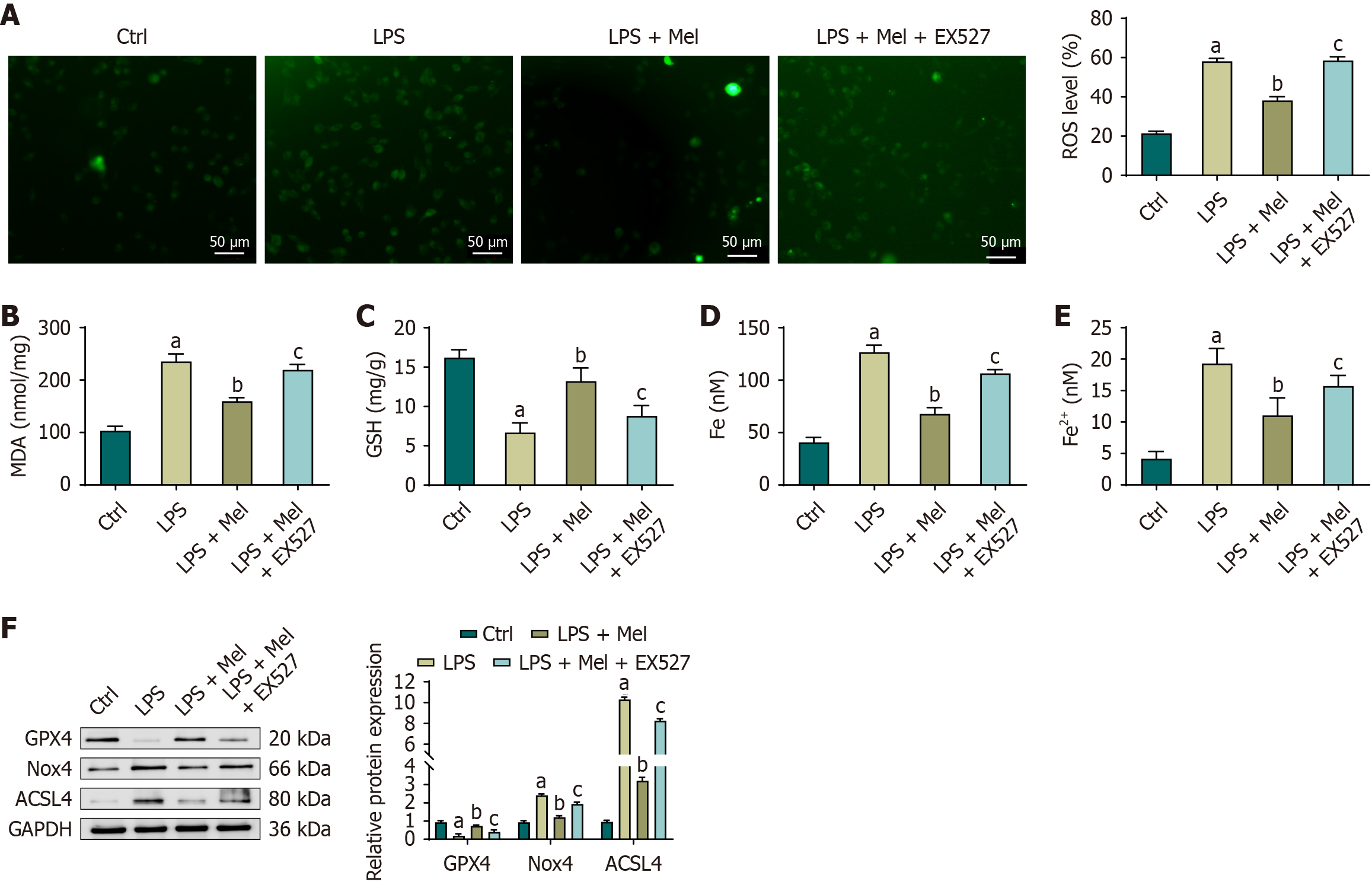 A: Myocardial reactive oxygen species measured by 2’,7’-dichlorodihydrofluorescein diacetate fluorescence microscopy with quantitative analysis; B-E: Cellular malondialdehyde, glutathione, total iron, and ferrous iron after treatment with lipopolysaccharide with or without melatonin or EX527; F: Representative immunoblots of glutathione peroxidase 4, NADPH oxidase 4, and acyl-CoA synthetase long-chain family member 4 in cardiac tissue (glyceraldehyde-3-phosphate dehydrogenase loading control) and densitometric quantification normalized to glyceraldehyde-3-phosphate dehydrogenase. One-way analysis of variance with Bonferroni post-hoc testing. aP < 0.01 vs control; bP < 0.01 vs lipopolysaccharide; cP < 0.01 vs lipopolysaccharide plus melatonin. ACSL4: Acyl-CoA synthetase long-chain family member 4; Ctrl: Control; Fe2+: Ferrous iron; GAPDH: Glyceraldehyde-3-phosphate dehydrogenase; GPX4: Glutathione peroxidase 4; GSH: Glutathione; LPS: Lipopolysaccharide; LPS + Mel: Lipopolysaccharide plus melatonin; LPS + Fer-1: Lipopolysaccharide plus ferrostatin-1; MDA: Malondialdehyde; Nox4: NADPH oxidase 4; ROS: Reactive oxygen species.
