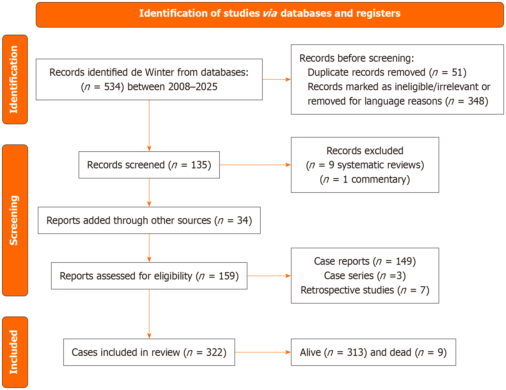 - Citation: Elmenyar E, Abbara MA, Al-Ghoul Z, Al Mahmeed W, Cander B, Abdelrahman AS, Al-Thani H, El-Menyar A. Phenomenon of “de Winter” pattern, sign, or syndrome: A systematic scoping review and data analysis. World J Cardiol 2026; 18(2): 114561