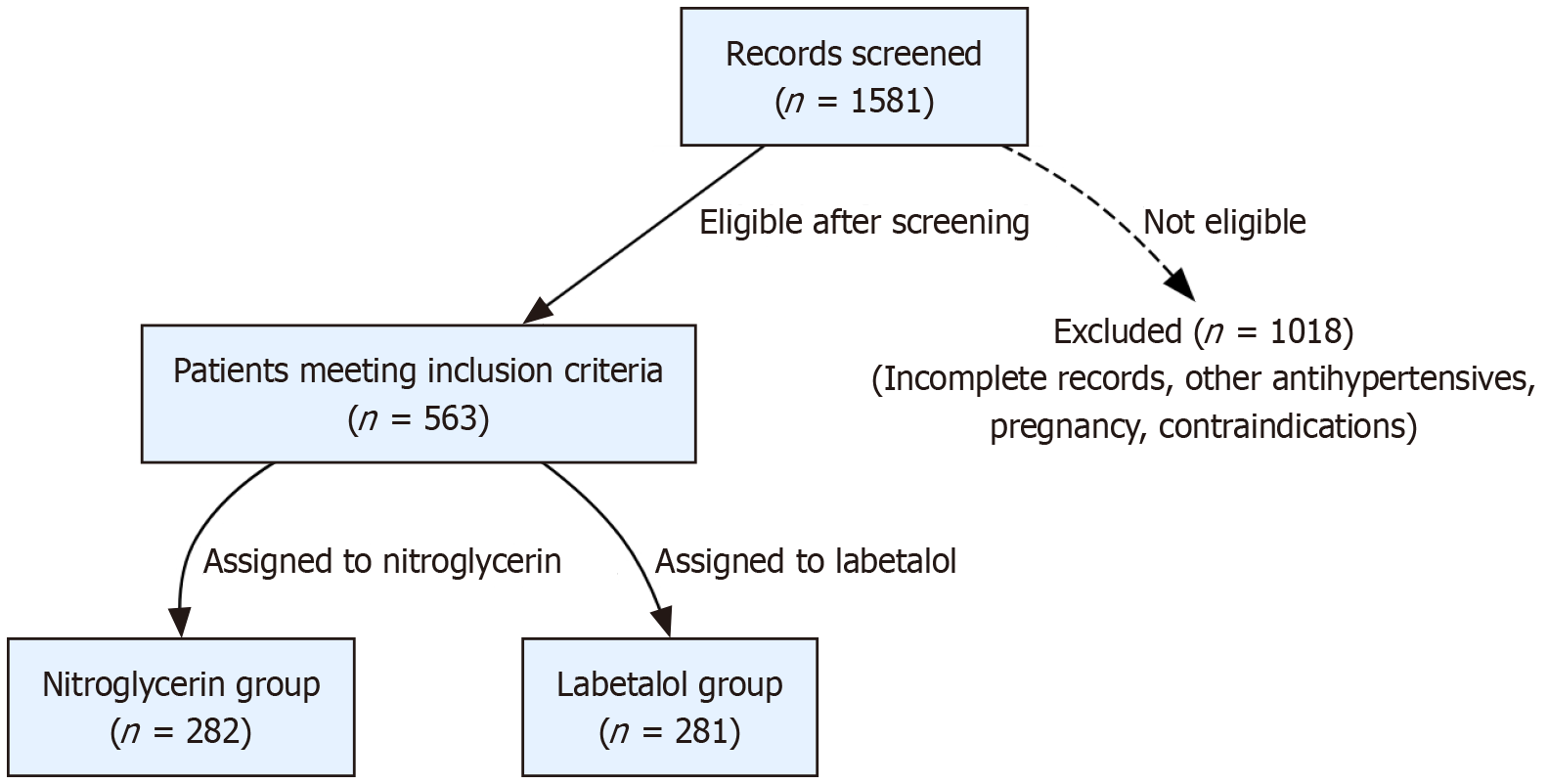 - Citation: Chaudhary AJ, Bhat WA, Ul Haq A, Rashid HU, Khan ID, Khan MND, Nawaz HMM, Ali S, Tariq MH. Efficacy of nitroglycerin vs labetalol in hypertensive emergency among patients with a history of coronary artery disease. World J Cardiol 2026; 18(2): 115528