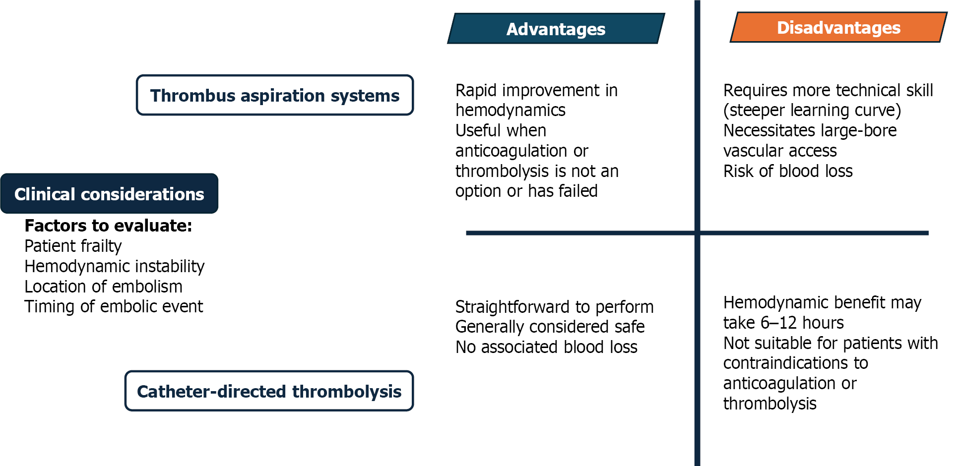 Furthermore, a collaborative, multidisciplinary evaluation is essential, and PERT involvement is recommended for all patients being considered for advanced intervention[10]. An additional factor in selecting appropriate candidates for CDT is understanding the nature of the thrombus. Determining whether a clot is fresh and fibrin-rich or more chronic and fibrotic can help in choosing both the appropriate therapeutic approach and the specific device to maximize procedural success. Recognizing complex cases-such as acute PE superimposed on chronic thromboembolic disease or pulmonary hypertension-is also vital for selecting the most effective and safe management strategy.