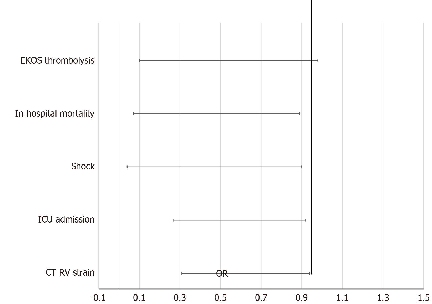 Radiographic RV strain on CT was significantly lower in the aspirin group (22.2% vs 34.8%; P = 0.029; OR = 0.536, 95%CI: 0.305-0.944) (Table 3). However, echocardiographic RV dysfunction, including strain, dilation, and hypokinesis, did not significantly differ between groups (P = 0.587). There were no significant differences in: (1) Mechanical ventilation: 6.7% vs 4.7% (P = 0.483; OR = 1.456, 95%CI: 0.517-4.021); (2) Cardiac arrest: 6.7% vs 6.0% (P = 0.826; OR = 1.117, 95%CI: 0.416-3.004); and (3) Pressor use: 2.2% vs 6.0% (P = 0.160; OR = 0.356, 95%CI: 0.079-1.597). Use of catheter-directed thrombolysis (Ekosonic endovascular system) was also significantly lower in aspirin users (3.3% vs 11.2%; P = 0.047; OR = 0.275, 95%CI: 0.081-0.931).