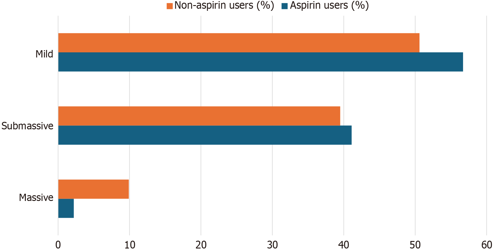 Prehospital aspirin use was associated with improved clinical outcomes (Table 3, Figure 1): (1) ICU admission: 16.7% vs 28.8% (P = 0.025; OR = 0.496, 95%CI: 0.266-0.924); (2) Shock: 2.2% vs 9.9% (P = 0.021; OR = 0.208, 95%CI: 0.048-0.899); (3) In-hospital mortality: 3.3% vs 11.6% (P = 0.022; OR = 0.260, 95%CI: 0.080-0.889); and (4) PE severity (Figure 2). There was a trend toward less severe PE among aspirin users, with a lower rate of massive PE (2.2% vs 9.9%; P = 0.067). Submassive (41.1% vs 39.5%) and mild PE (56.7% vs 50.6%) rates were comparable.