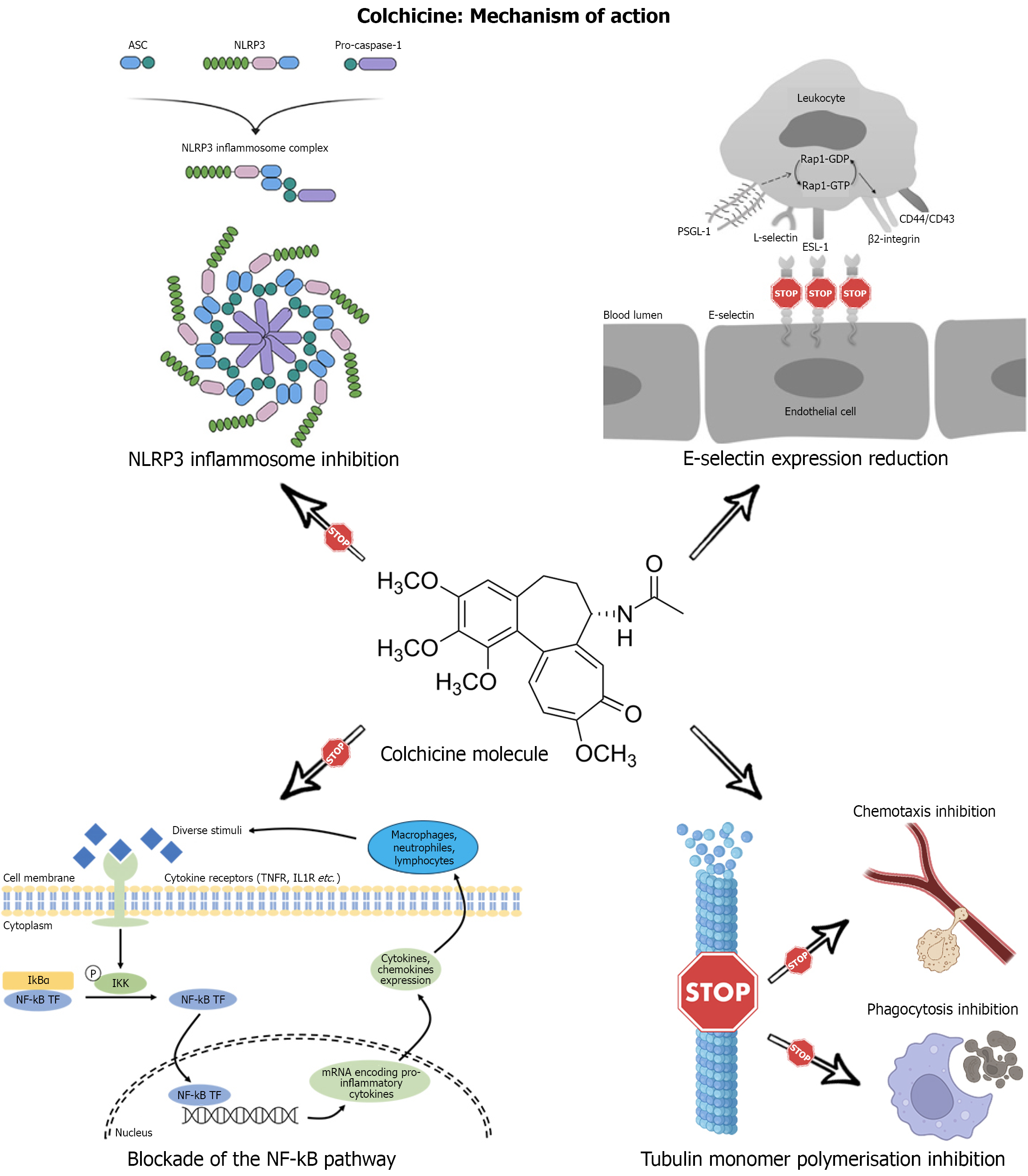 Microtubules are tubular structures based on tubulin heterodimers composed of α-tubulin and β-tubulin[17]. Microtubule polymerization and depolymerization processes underlie smooth muscle cell chemotaxis and migration[18]. Colchicine’s primary mechanism of action is the binding of the C-ring to β-tubulin so that the polymerization of tubulin monomers is prevented[19]; consequently, leukocyte phagocytosis and chemotaxis are inhibited[20] (Figure 1).