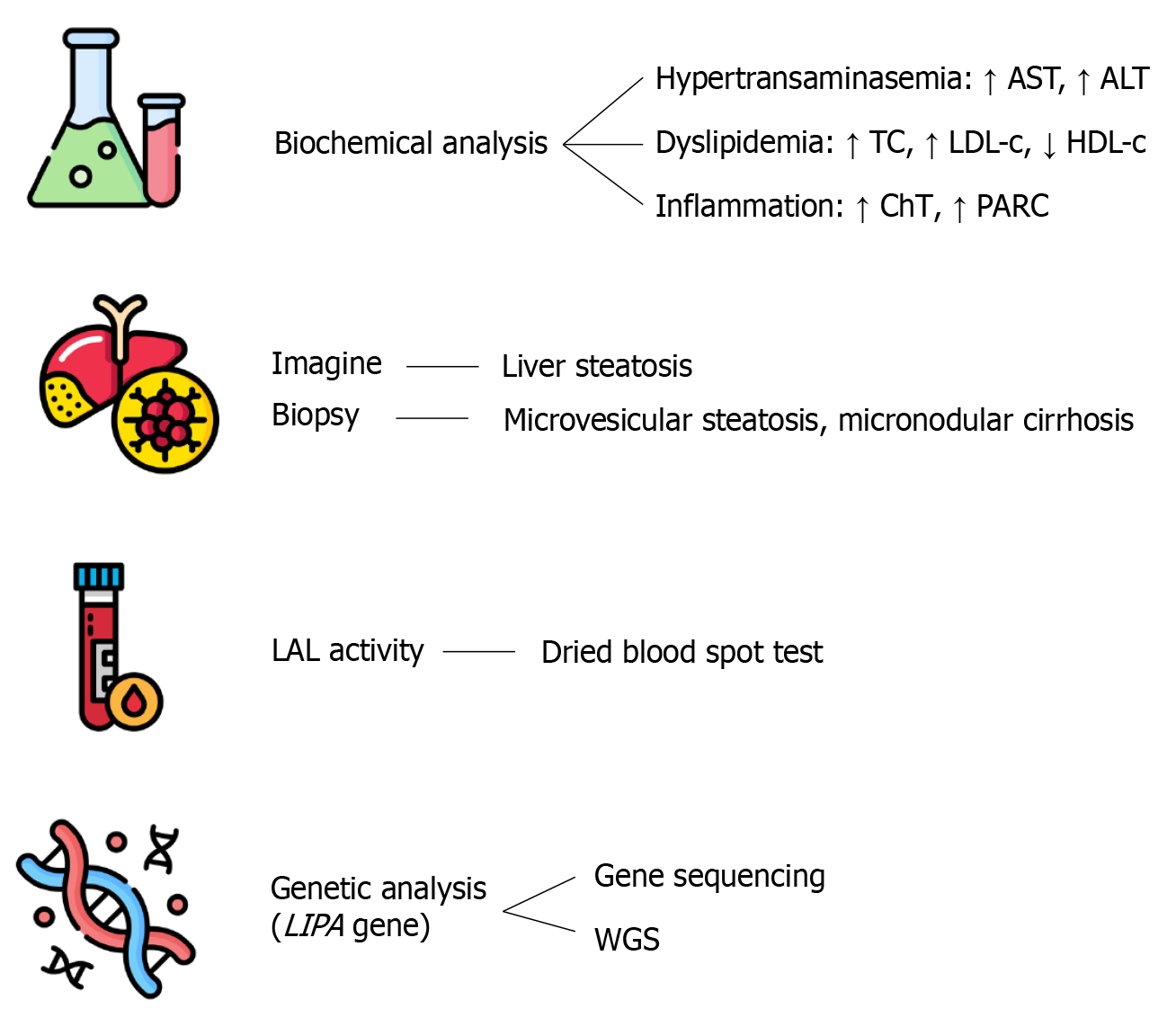 As LAL-D prevalence is low and clinical manifestations are often nonspecific, diagnosis can be very challenging. The diagnostic process is based on different assessments, which include: Biochemical analysis, imaging and histological tools, enzyme activity test, and genetics evaluation[14] (Figure 1).