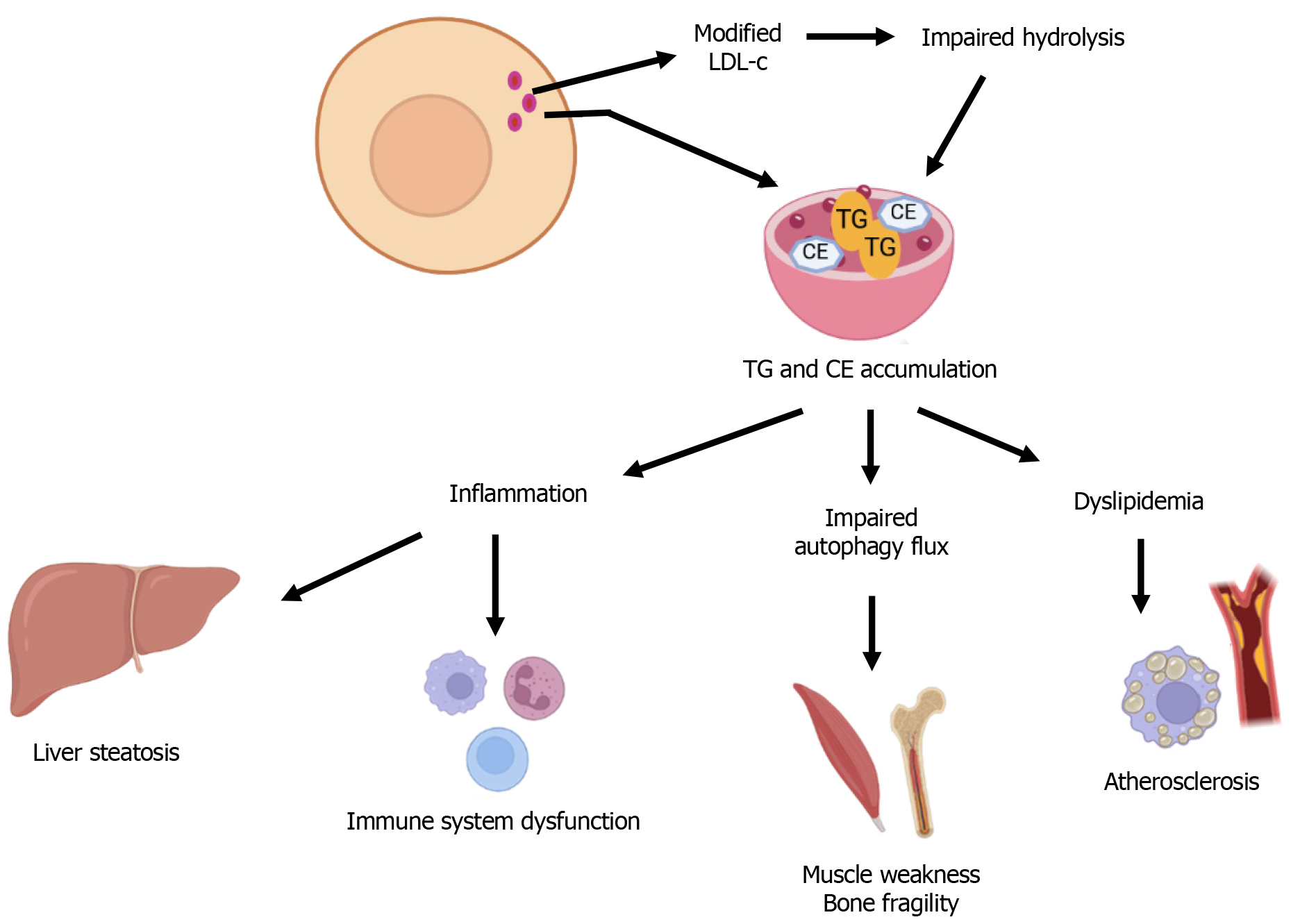 LAL-D leads to a systemic disturbance in intracellular lipid homeostasis, with far-reaching biological consequences. The primary biochemical defect involves impaired hydrolysis of CE and TG derived from modified LDL-c into free cholesterol and fatty acids within lysosomes. This impairment results in the progressive accumulation of these lipids in the liver, vasculature, immune cells, and bone spectroscopy[33] (Figure 2). The resulting metabolic derangements trigger a cascade of dysfunctions at the cellular and tissue levels, underpinning the clinical heterogeneity of LAL-D and its association with both hepatic and cardiovascular pathology, as discussed below.