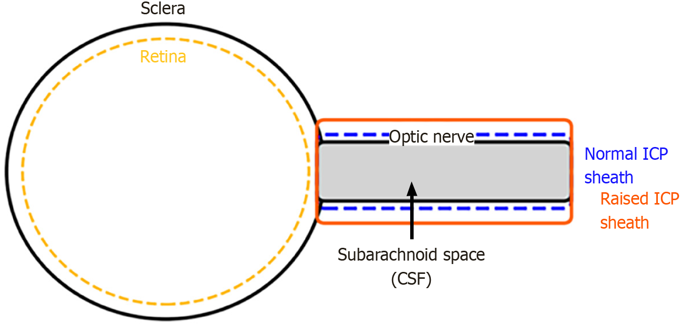 Figure 1 Anatomical relationship of the optic nerve sheath to the intracranial subarachnoid space, illustrating sheath expansion in raised intracranial pressure.