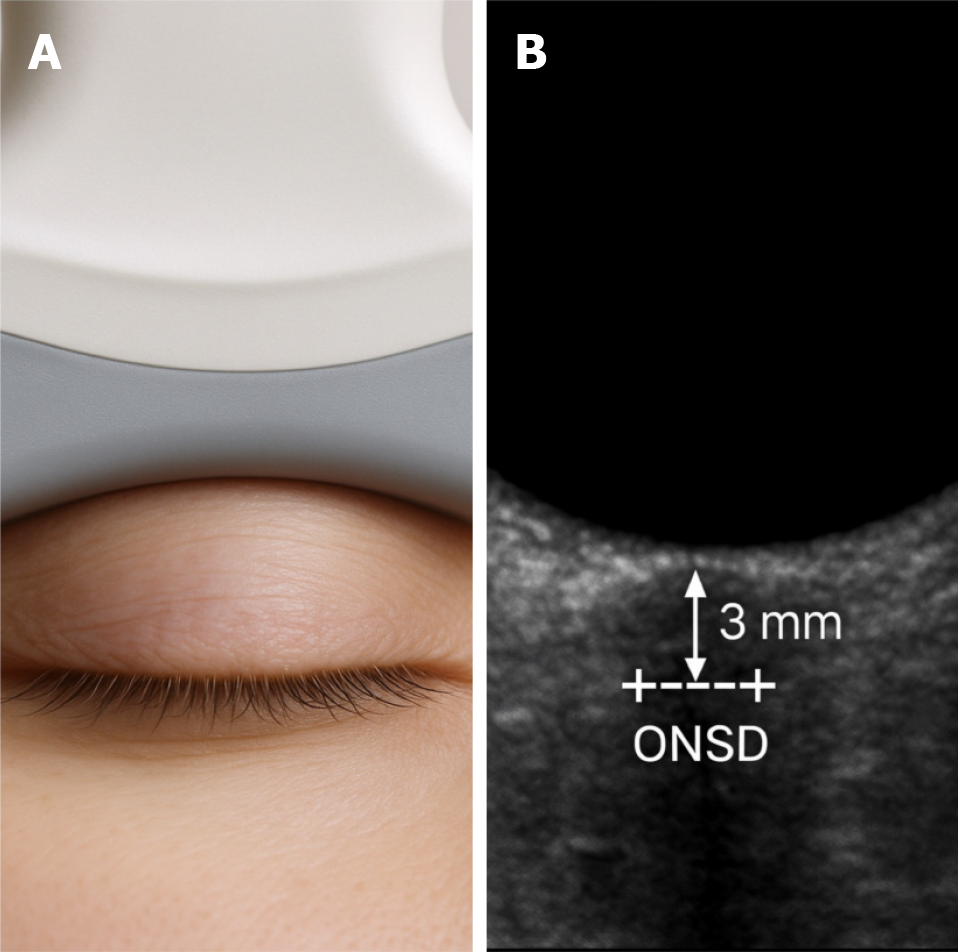 A: Proper ultrasound probe placement over the closed eyelid for optic nerve sheath diameter measurement; B: Sonographic image of the optic nerve sheath diameter with calipers placed 3 mm posterior to the retina. ONSD: Optic nerve sheath diameter.