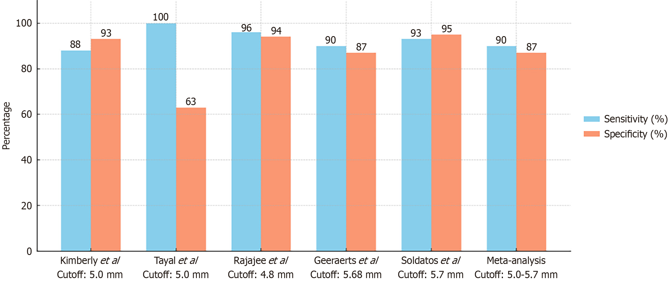 Diagnostic accuracy of point-of-care ultrasound–measured optic nerve sheath diameter for detecting raised intracranial pressure, showing sensitivity, specificity, and cut-off values from key studies.