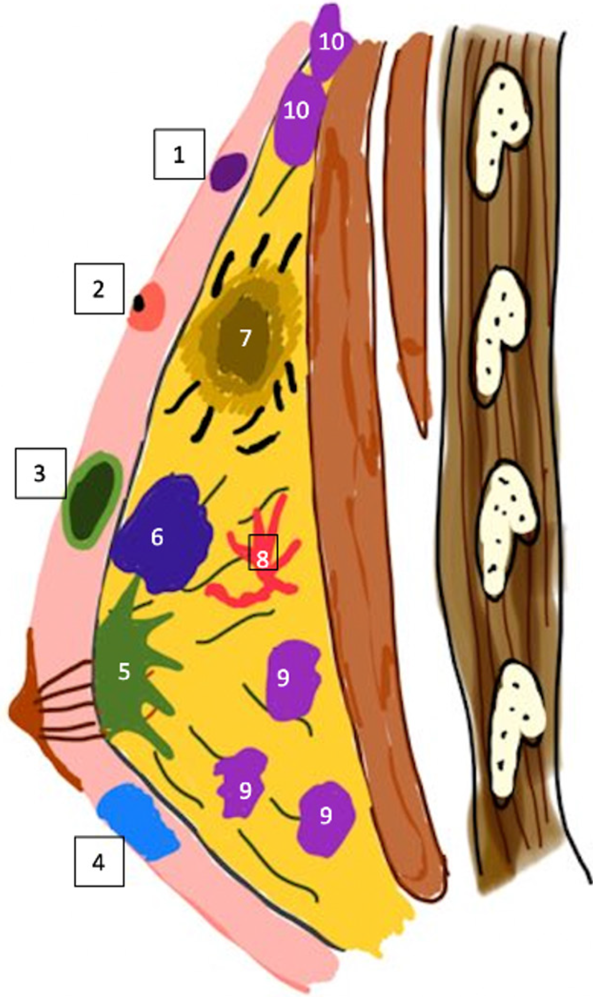 1: Epidermal inclusion cyst; 2: Sebaceous cyst with punctum; 3: Lipoma with capsule; 4: Hematoma; 5: Gynecomastia; 6: Carcinoma breast; 7: Mastitis with abscess and surrounding trabecular thickening; 8: Vascular malformation; 9: Lymphoma; 10: Axillary lymph nodes.