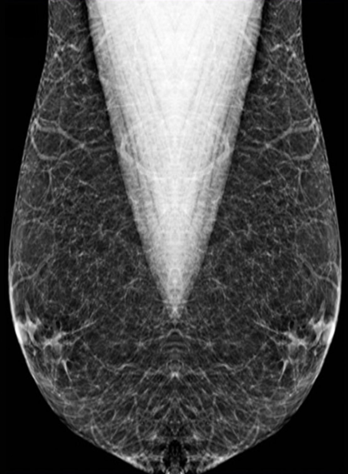 Pseudogynecomastia: Mediolateral oblique mammography view of a 17-year-old obese male showing a diffuse bilateral increase in fat density.