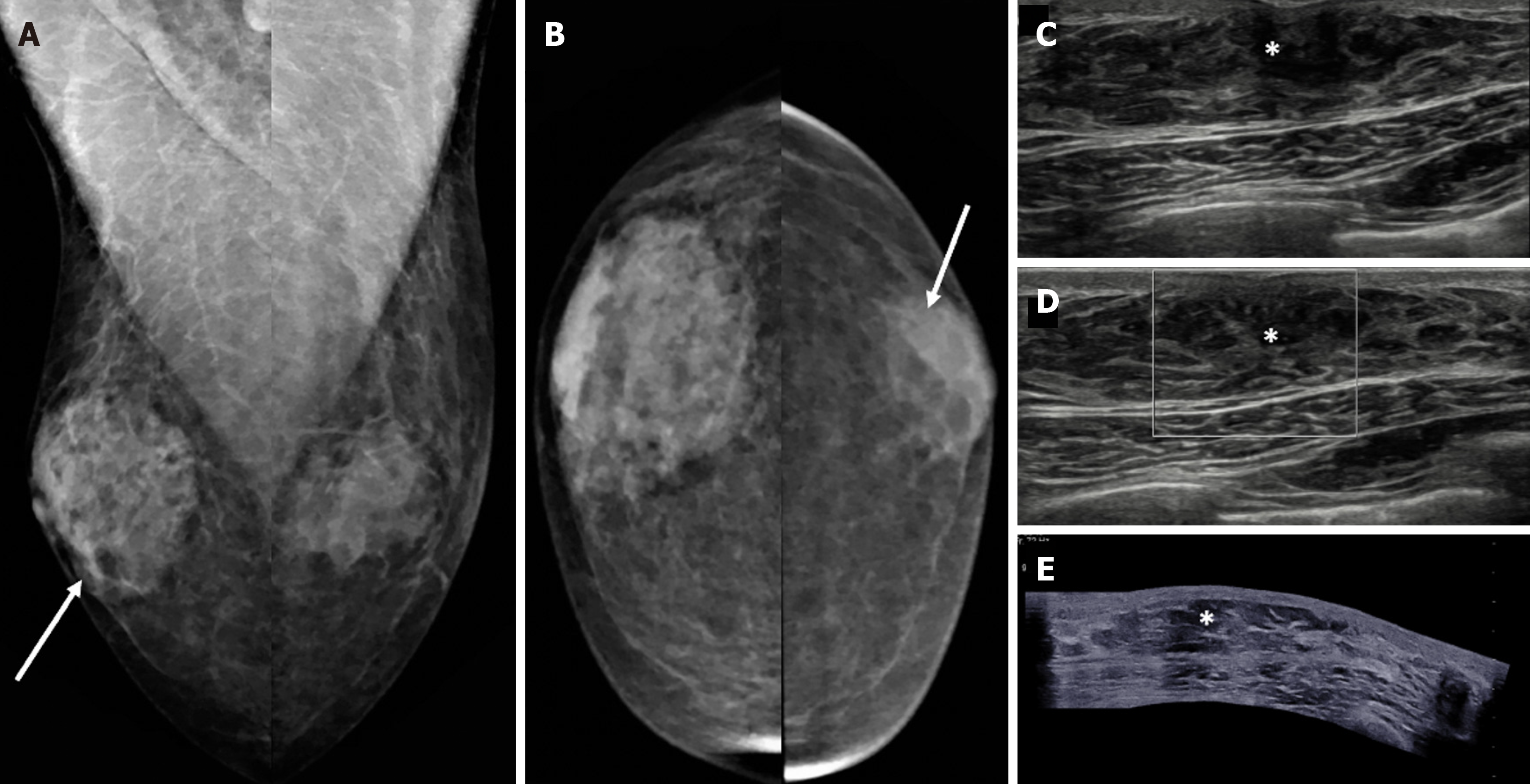 A: Mediolateral oblique; B: Craniocaudal mammography views show oval equal density masses in the retroareolar locations of both breasts (white arrows); C-E: Ultrasound images [C, D (color Doppler) and E (panoramic views)] demonstrate an oval parallel indistinct hypoechoic area (denoted by asterisks) in the retroareolar location with no evident vascularity, which is consistent with gynecomastia.