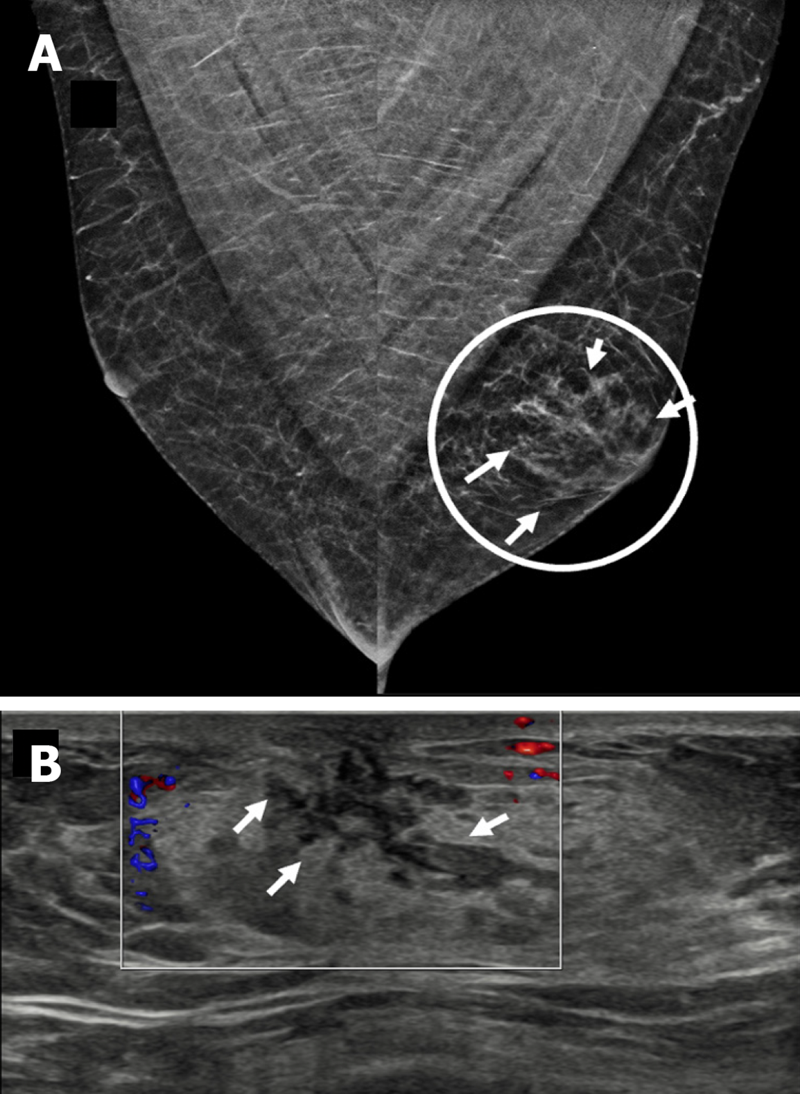 A: Mediolateral oblique mammography view showing a triangular flame-shaped area of increased density in the retroareolar location of the left breast (encircled); B: Ultrasound image showing an irregular hypoechoic retroareolar lesion with dendritic projections inside the underlying glandular fat (small white arrows).