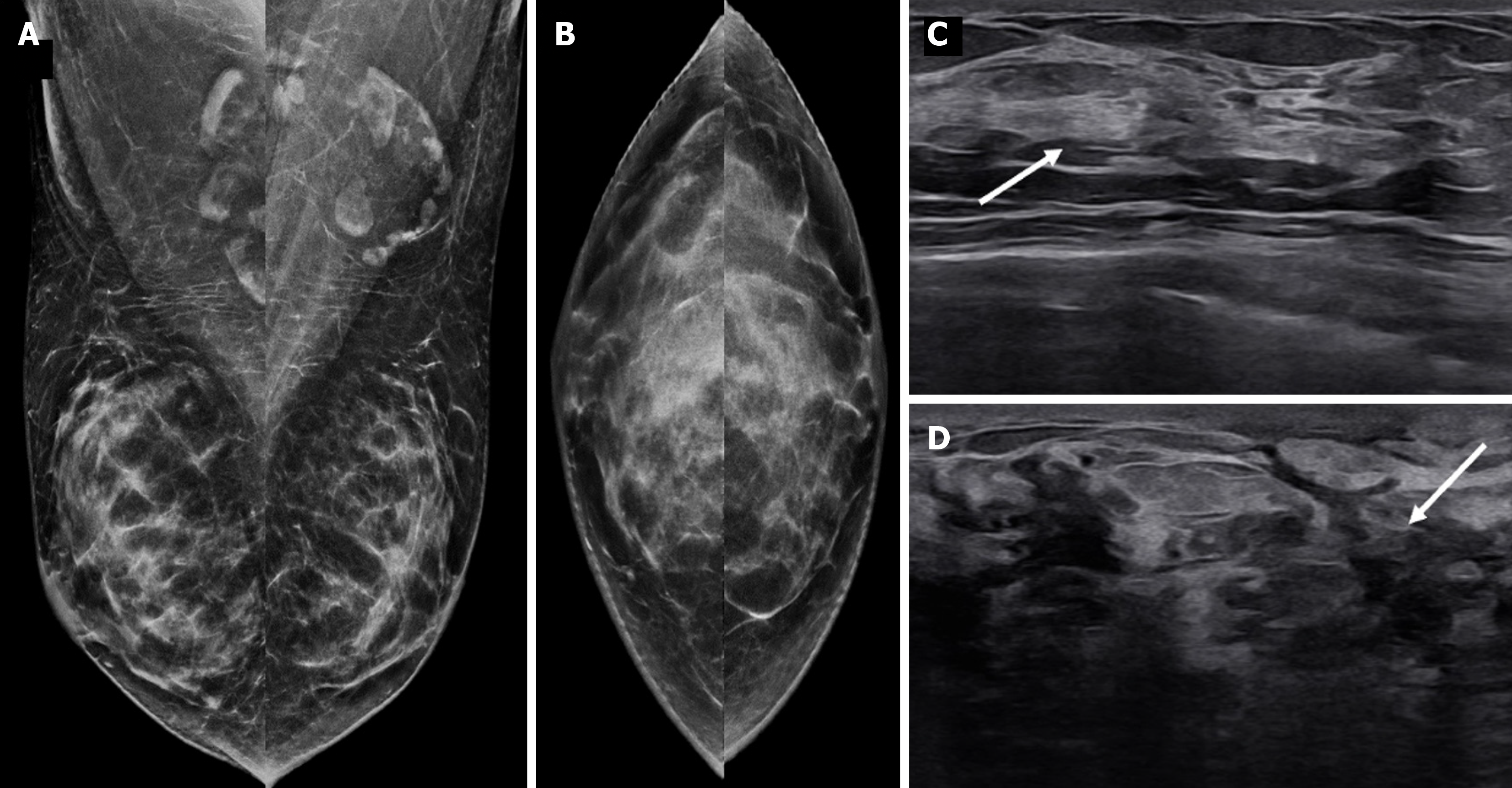 A: Mediolateral oblique; B: Craniocaudal mammography images showing a diffuse increase in breast density, with the male breast resembling the female breast; C and D: Ultrasound images showing diffuse deposition of glandular tissue (white arrows).