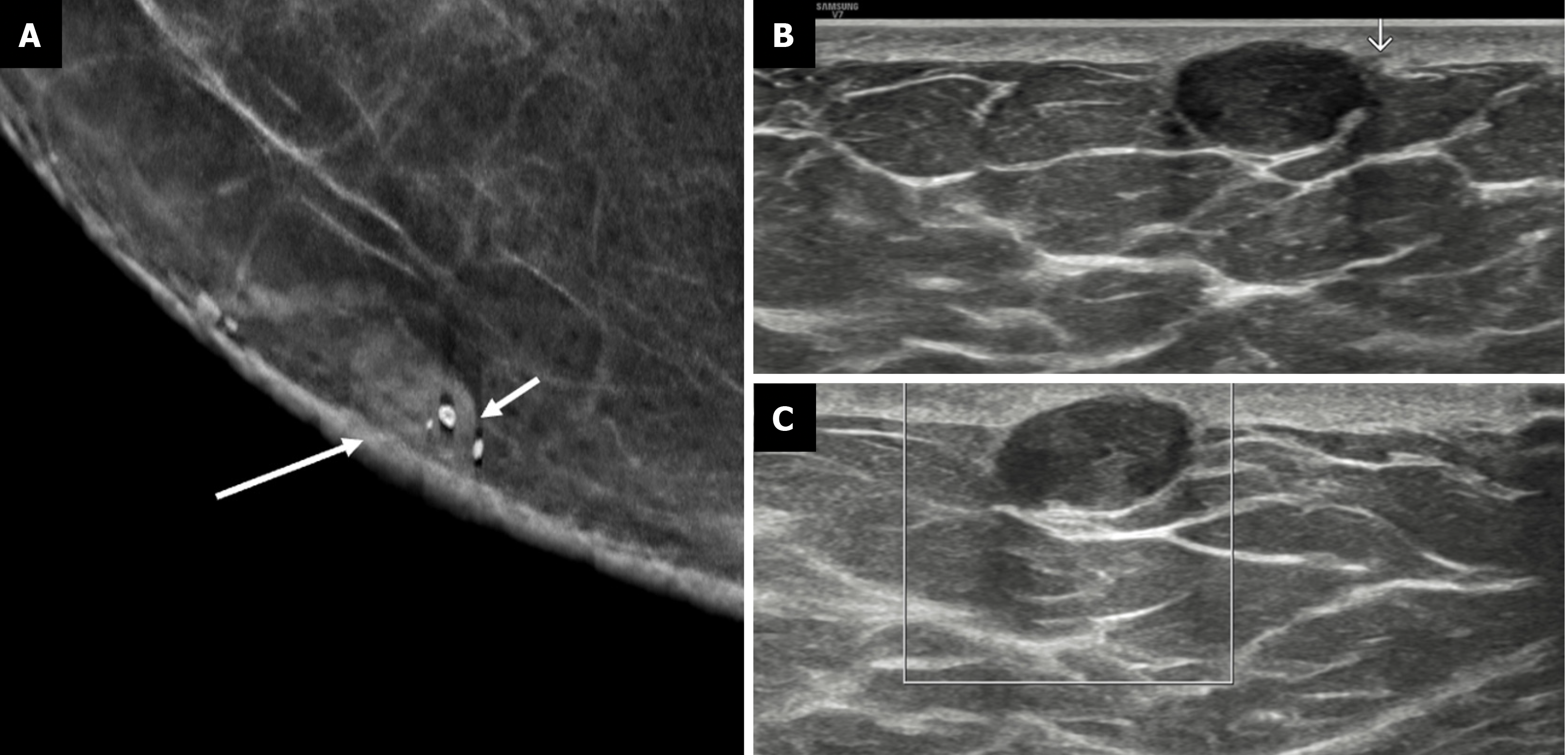 A: Mag nified mediolateral oblique mammography view of the right breast showing an oval circumscribed high-density mass just below the skin (white arrow) with few foci of dystrophic eccentric calcifications (small white arrow in A). B: Ultrasound; C: Color Doppler images showing an oval circumscribed hypoechoic mass in the subcutaneous plane, with a linear hypoechoic tract reaching the skin surface (arrow in B) and no internal vascularity (C).