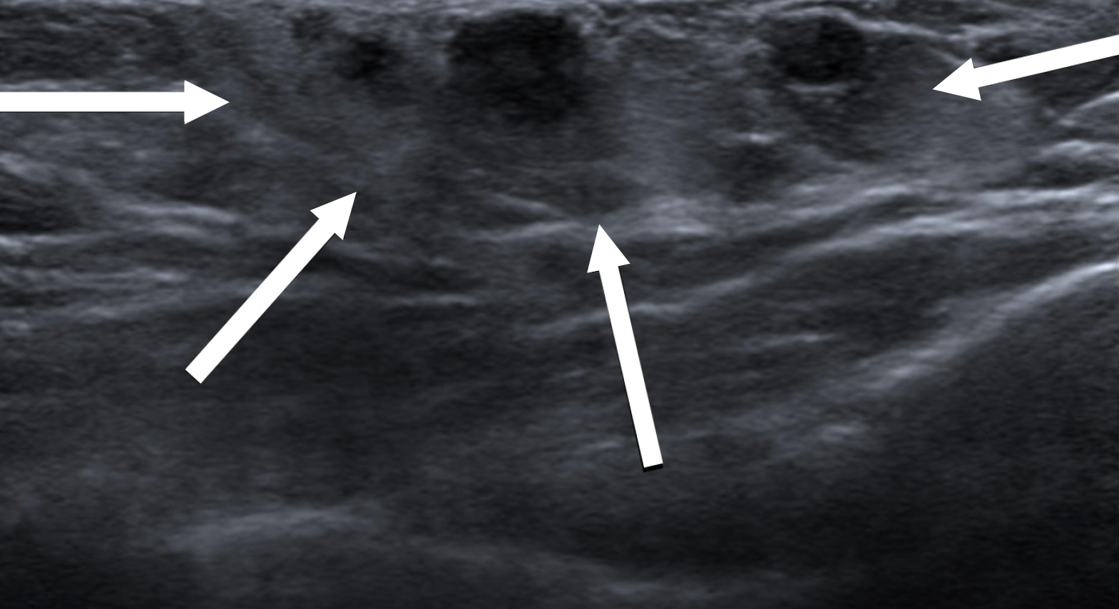 Fat necrosis in a 23-year-old male who suffered trauma to the right breast by football shows an irregular hyperechoic area with indistinct margins (white arrows) containing few anechoic areas.