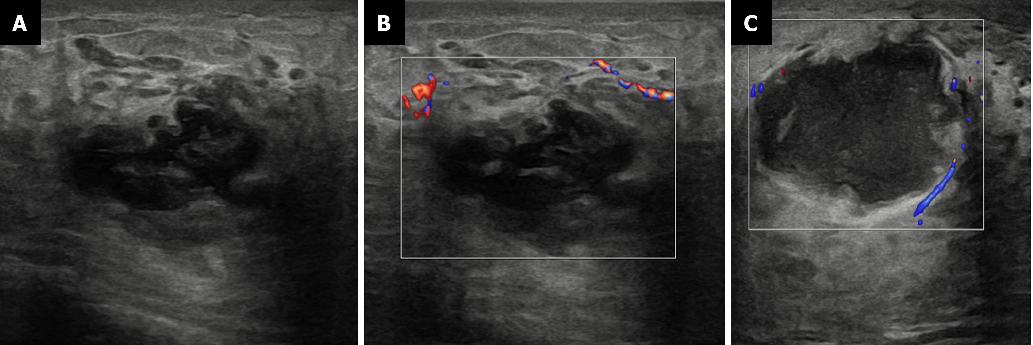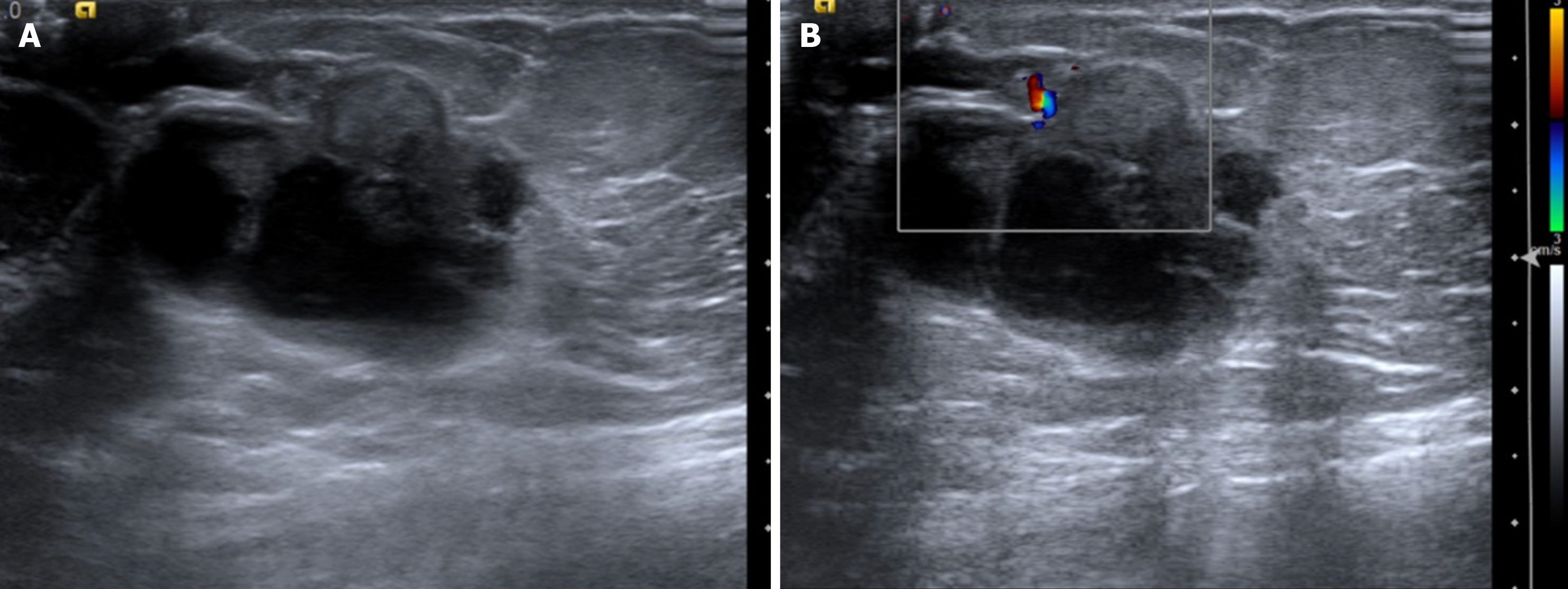 A: Ultrasound; B: Color Doppler images showing an irregular solid-cystic mass with an eccentric solid component, with minimal peripheral vascularity.