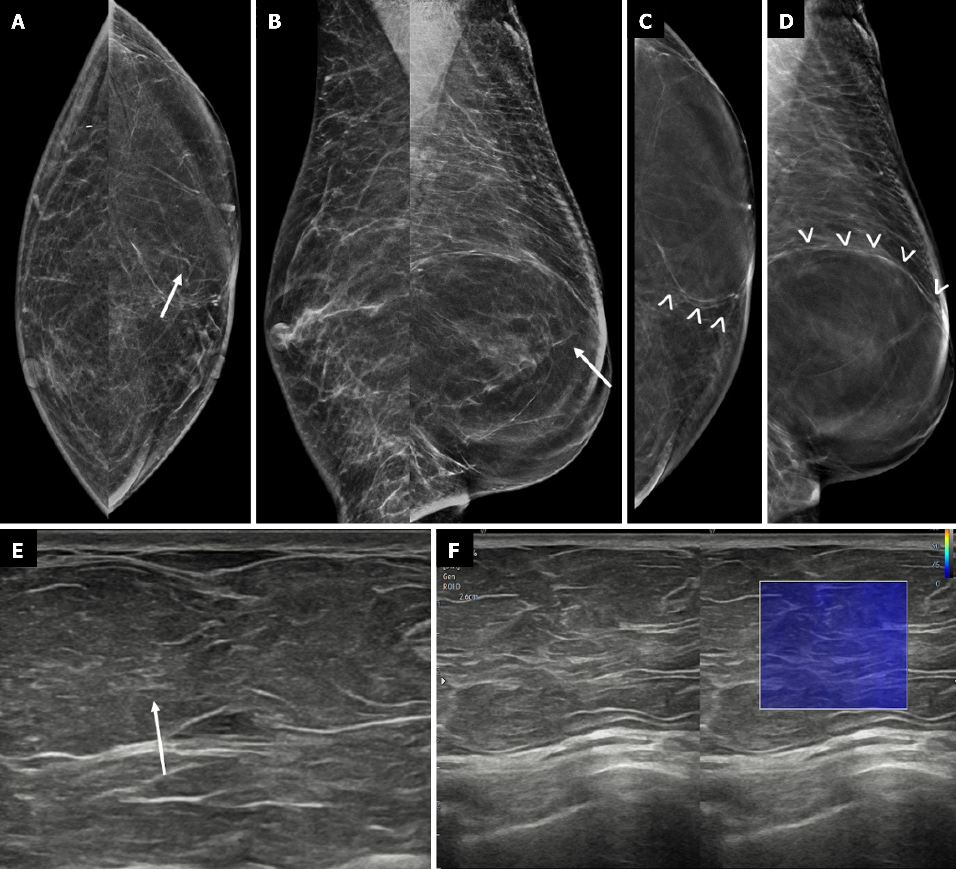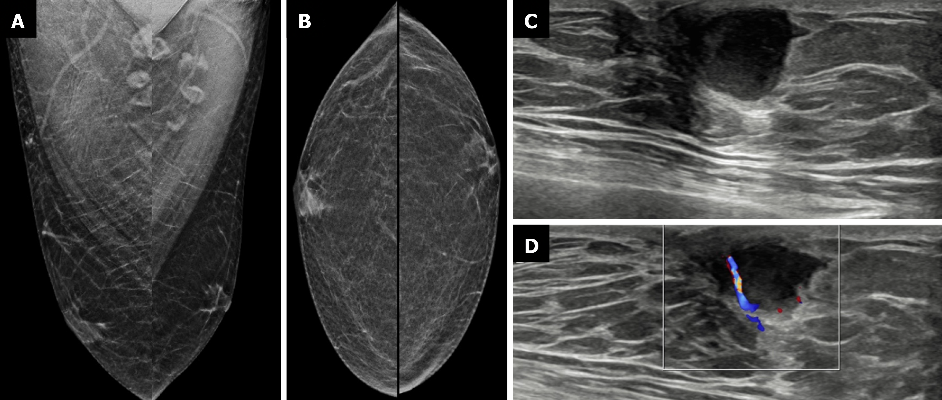 A: Mediolateral oblique; B: Craniocaudal mammography views showing no obvious abnormality; C: Ultrasound; D: Color Doppler images revealing a well-defined anechoic collection with peripheral internal vascularity.