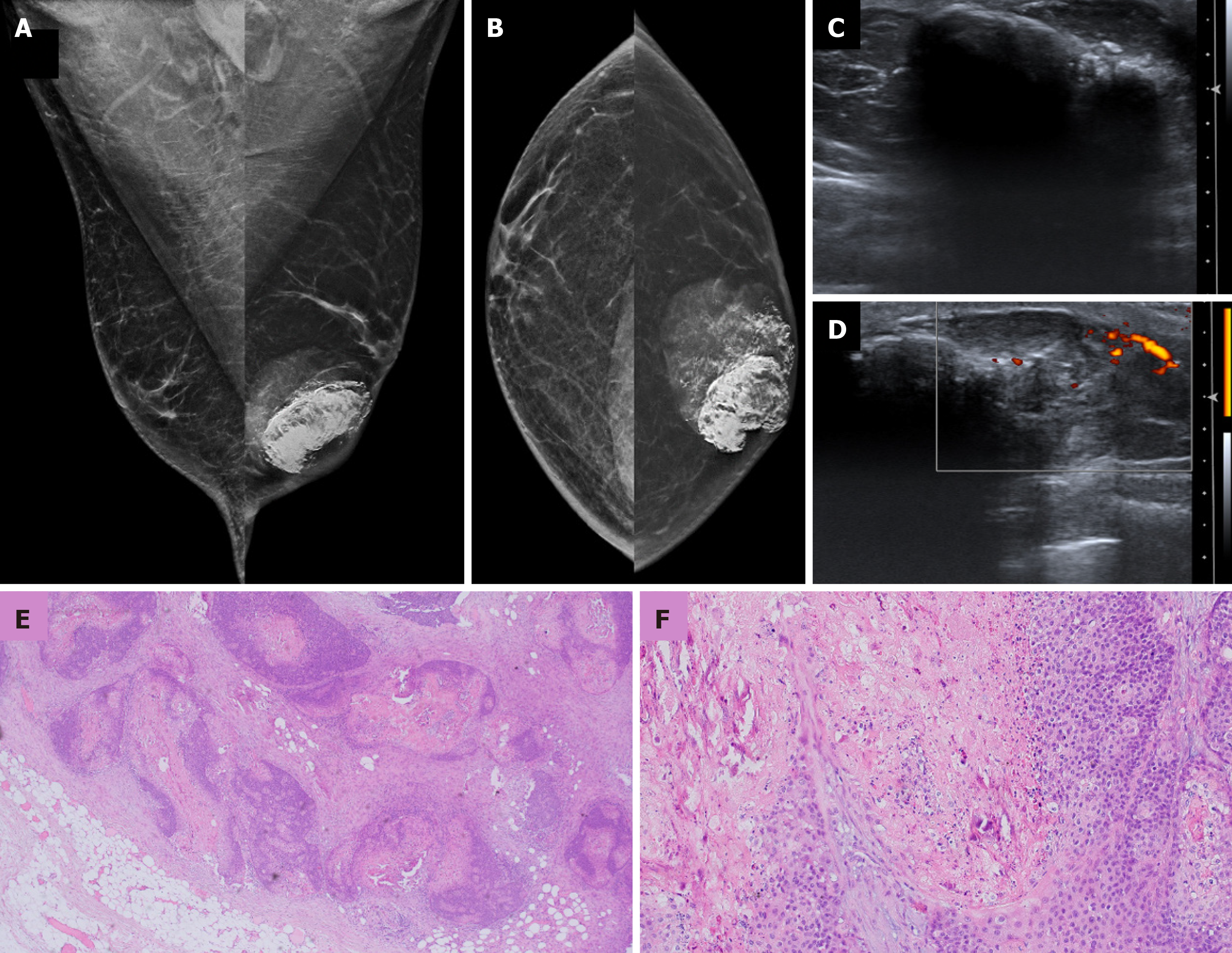 A: Mediolateral oblique and B: Craniocaudal mammography images showing a large irregular high-density mass with circumscribed margins and coarse calcifications in the retroareolar location; C: Ultrasound; D: Color Doppler images showing an irregular lesion with extensive posterior acoustic shadowing and some internal vascularity; E and F: Histopathology images (hematoxylin and eosin, × 40) showing a circumscribed lobulated mass in subcutaneous tissue and islands of basaloid cells exhibiting abrupt keratinization without an intervening granular layer along with shadow cells and central calcification.
