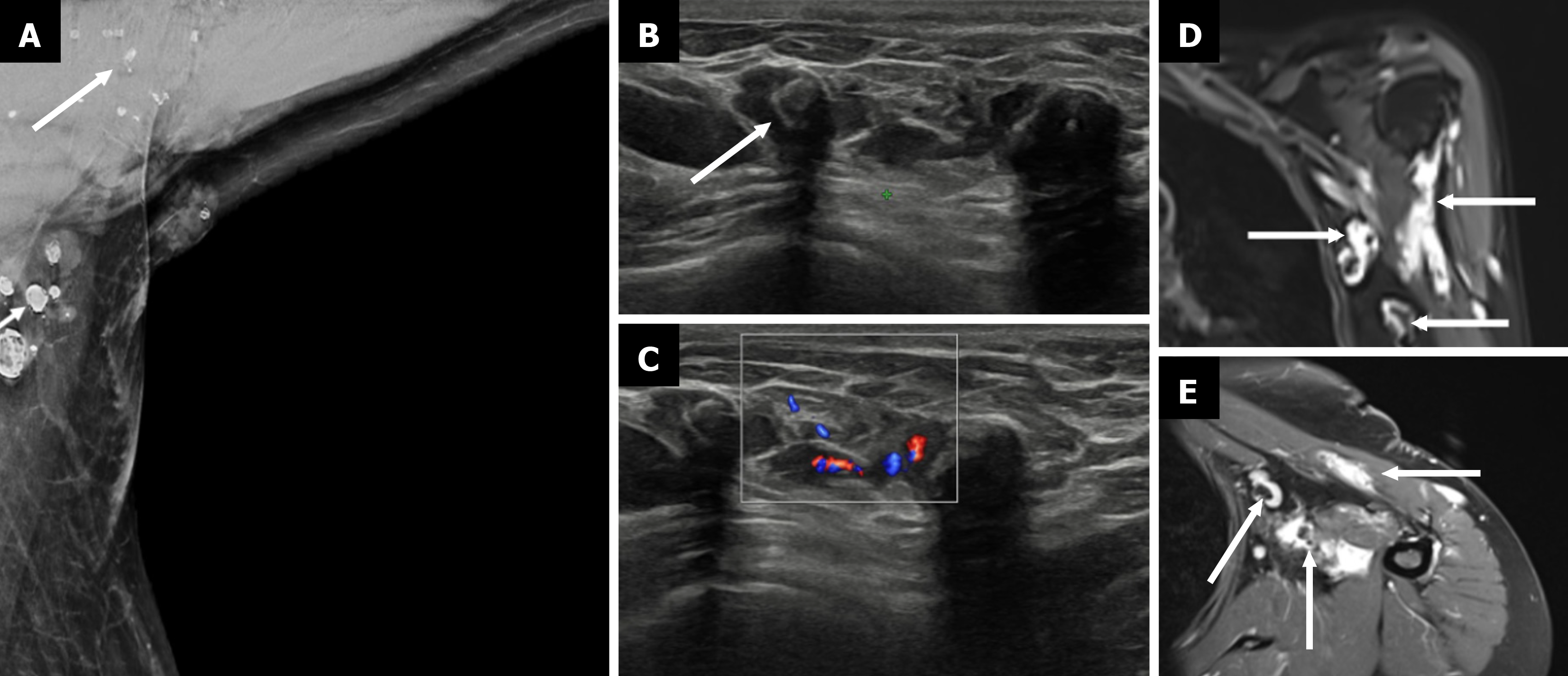 A: Mediolateral oblique mammogram with an axillary view shows multiple well-defined, lobulated densities in the axilla (arrow), some containing coarse calcifications; B: Grayscale ultrasound reveals multiple anechoic and hypoechoic compressible tubular channels in the subcutaneous plane with echogenic phleboliths (arrow), which is consistent with dilated venous and lymphatic components; C: Color Doppler ultrasound demonstrates slow flow within some of the vascular channels; D: Coronal T2-weighted fat-saturated magnetic resonance image (MRI) shows hyperintense lobulated masses (arrows) in the axilla; E: Postcontrast axial T1-weighted fat-suppressed MRI shows enhancement of the lesion (thin arrows), with nonenhancing phleboliths, which is consistent with a benign low-flow vascular malformation.